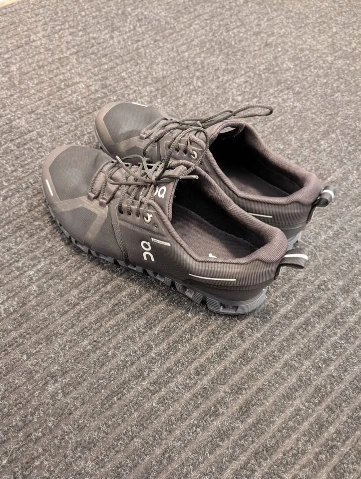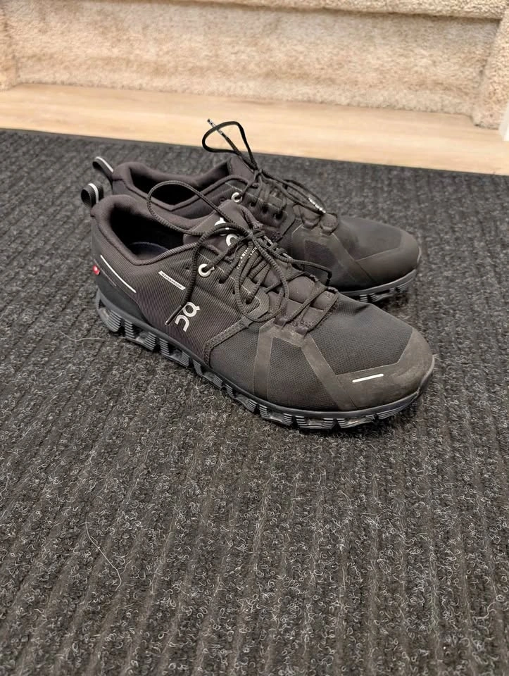 Black men's On Cloud 6 shoes, very lightly worn (less than 10 times). Fit wasn't right for me, otherwise they are very comfortable shoes. Size is 10.5 US, comes with the laces shown in the picture and also the On laces that you don't need to tie.
