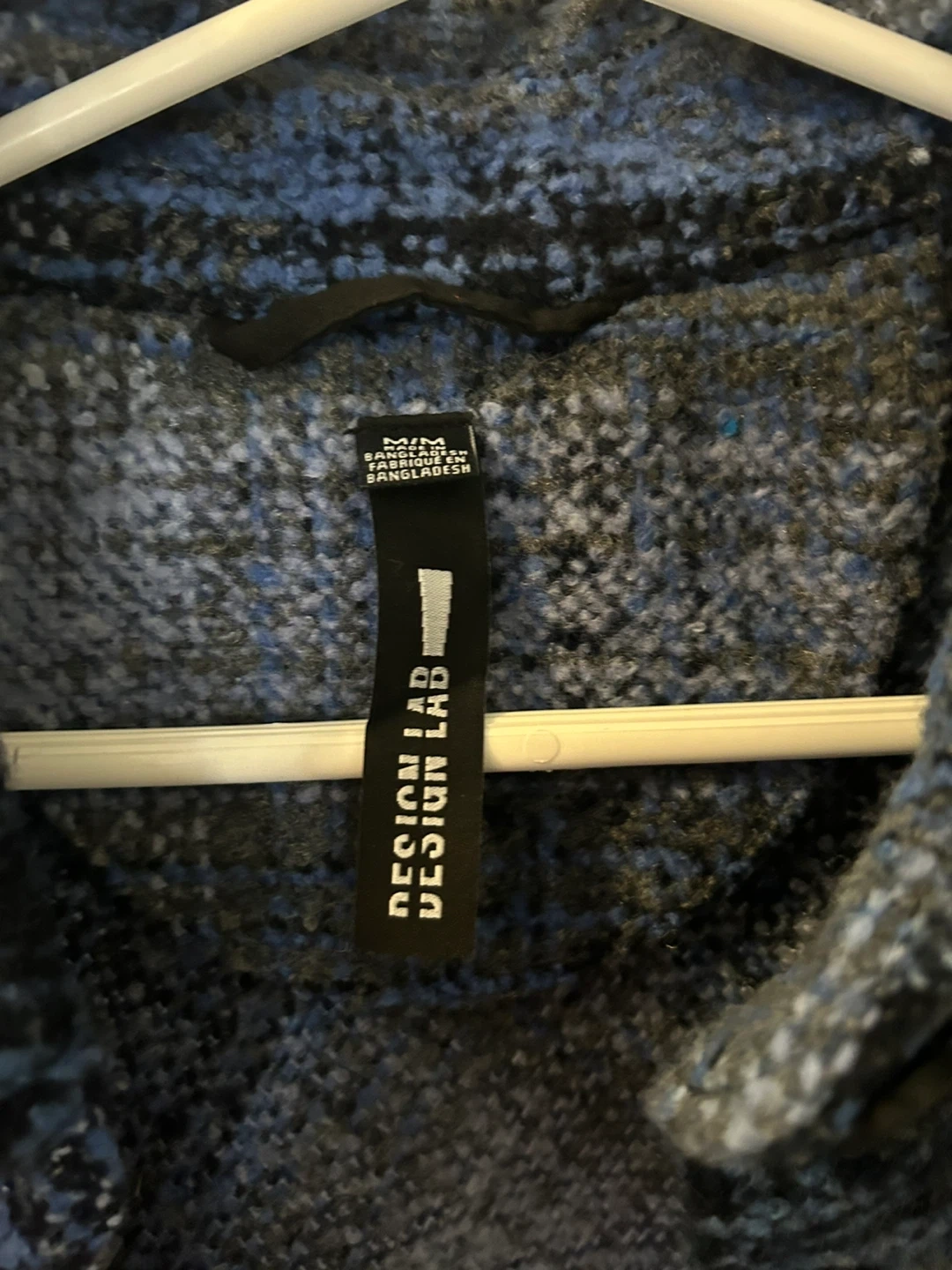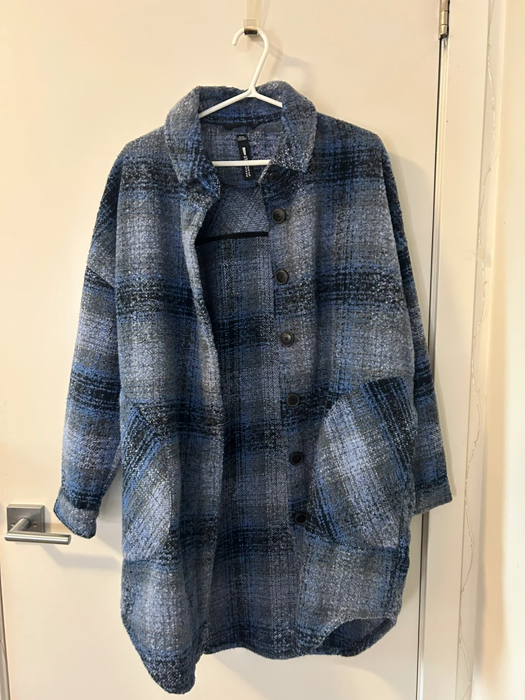 Cozy Design Lab shacket in a stylish blue plaid pattern! It's a size medium and features a button-up front and handy pockets. Perfect for layering on those cooler days!
