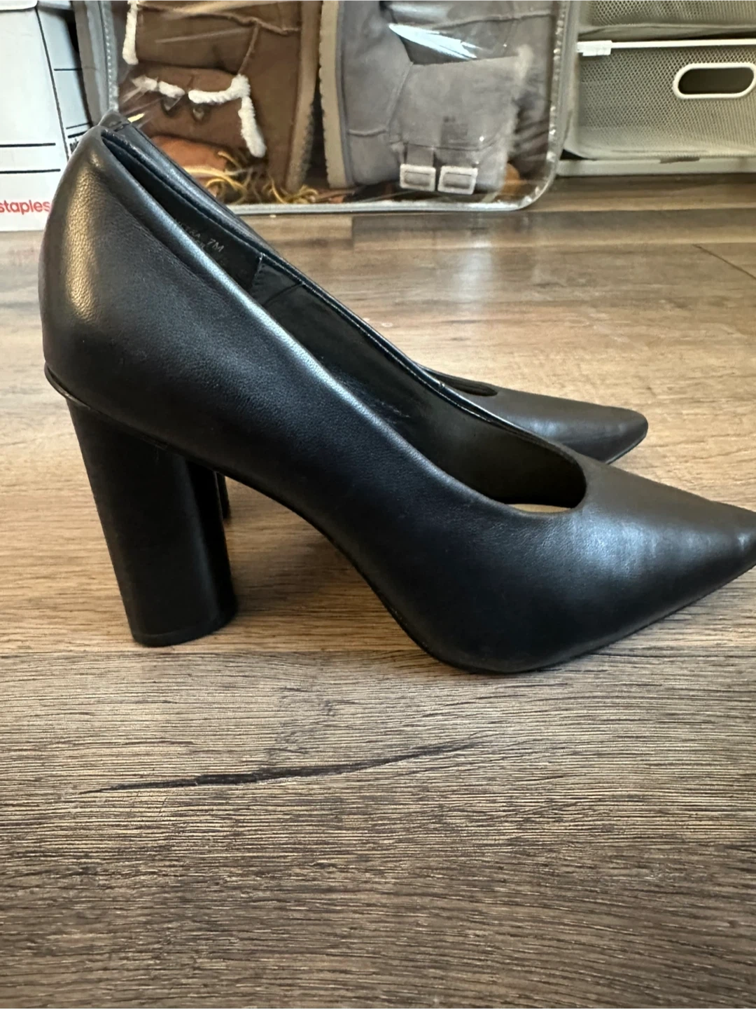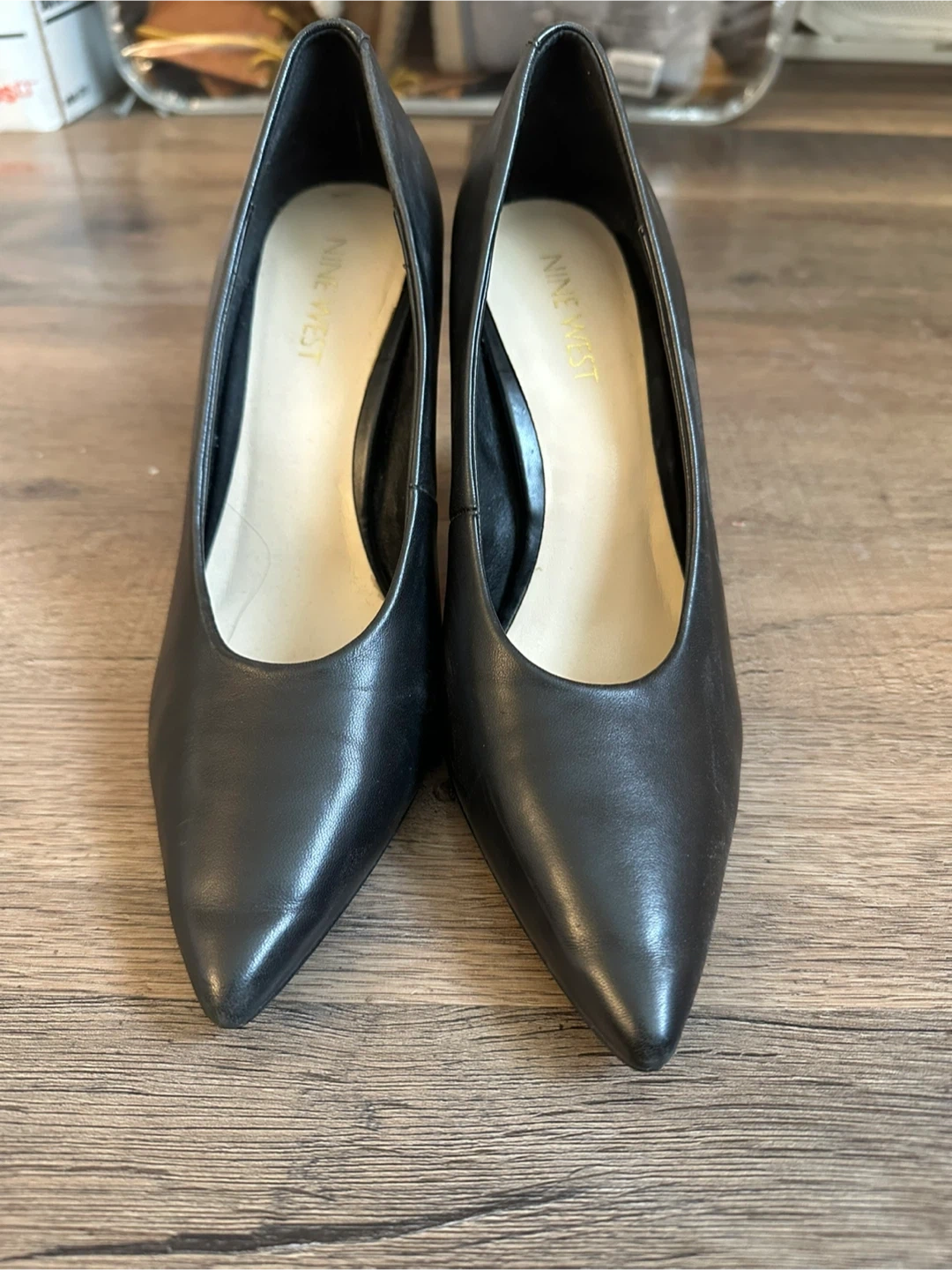 Selling a pair of Nine West black leather heels in size 7M. They're in great condition and would be a stylish addition to your wardrobe! Barely used.