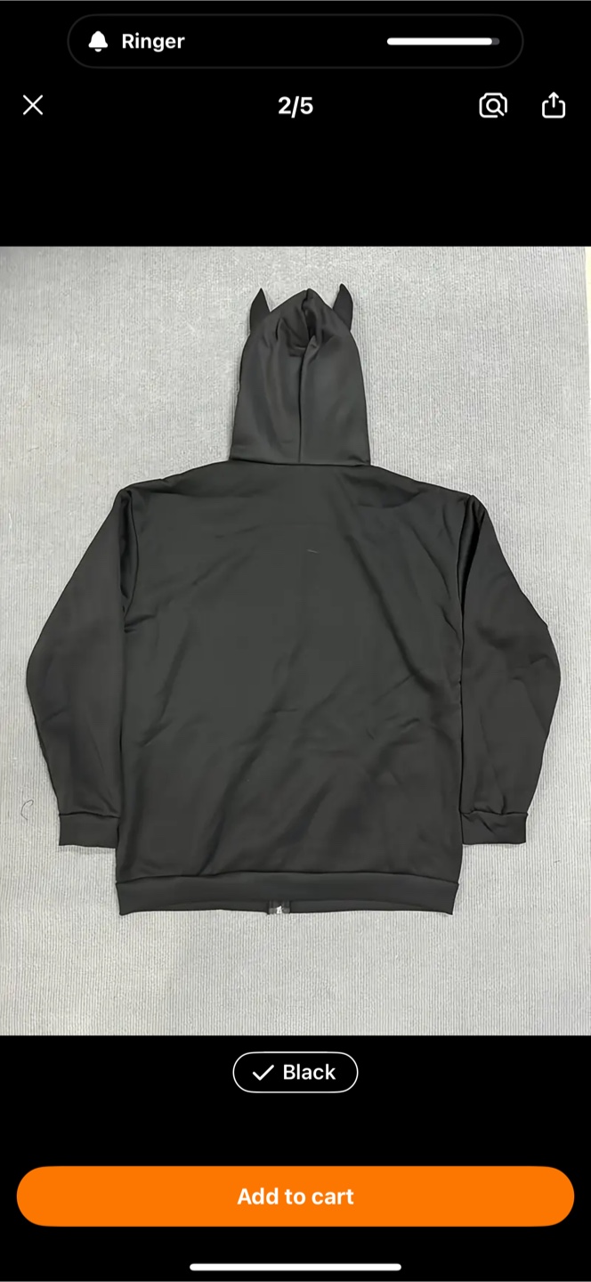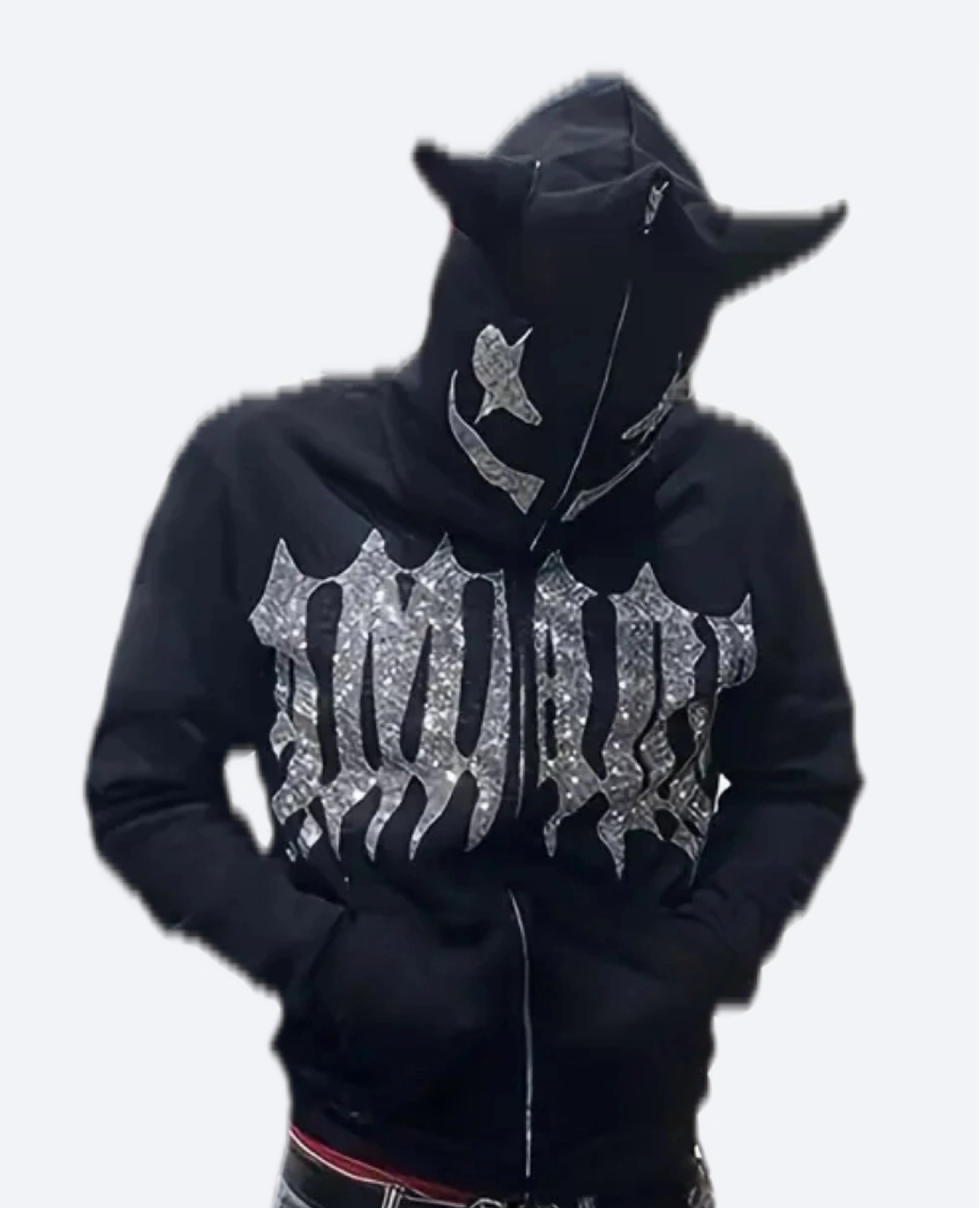 Selling a black zip-up hoodie with devil horns on the hood. It has a unique design with a graphic on the front. Perfect for adding a bit of edge to your wardrobe!