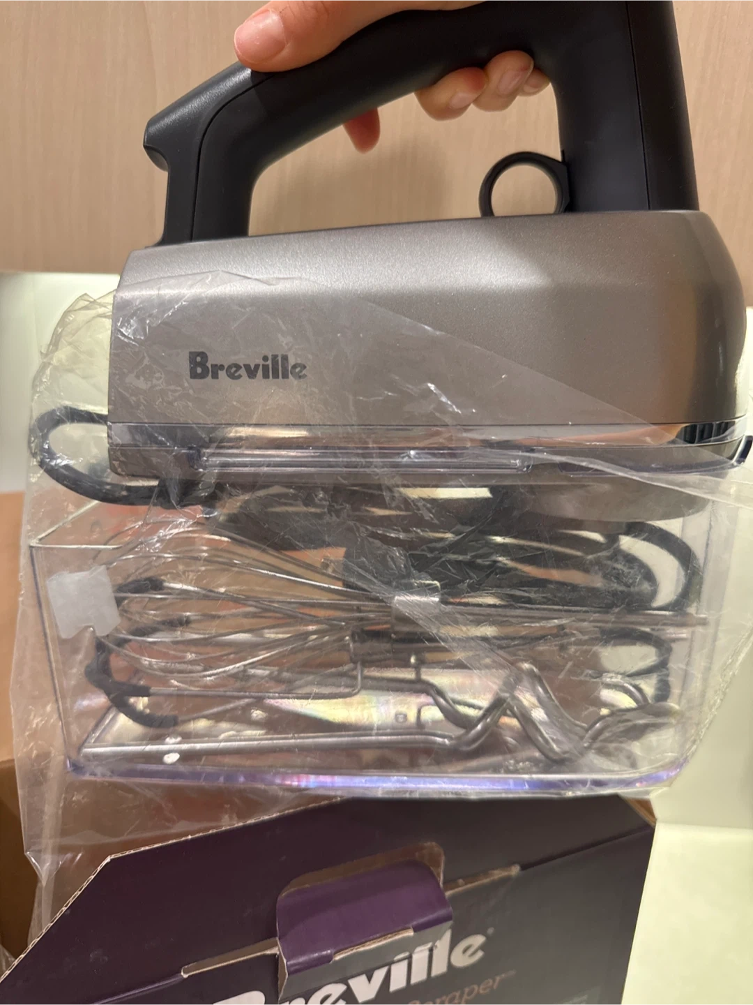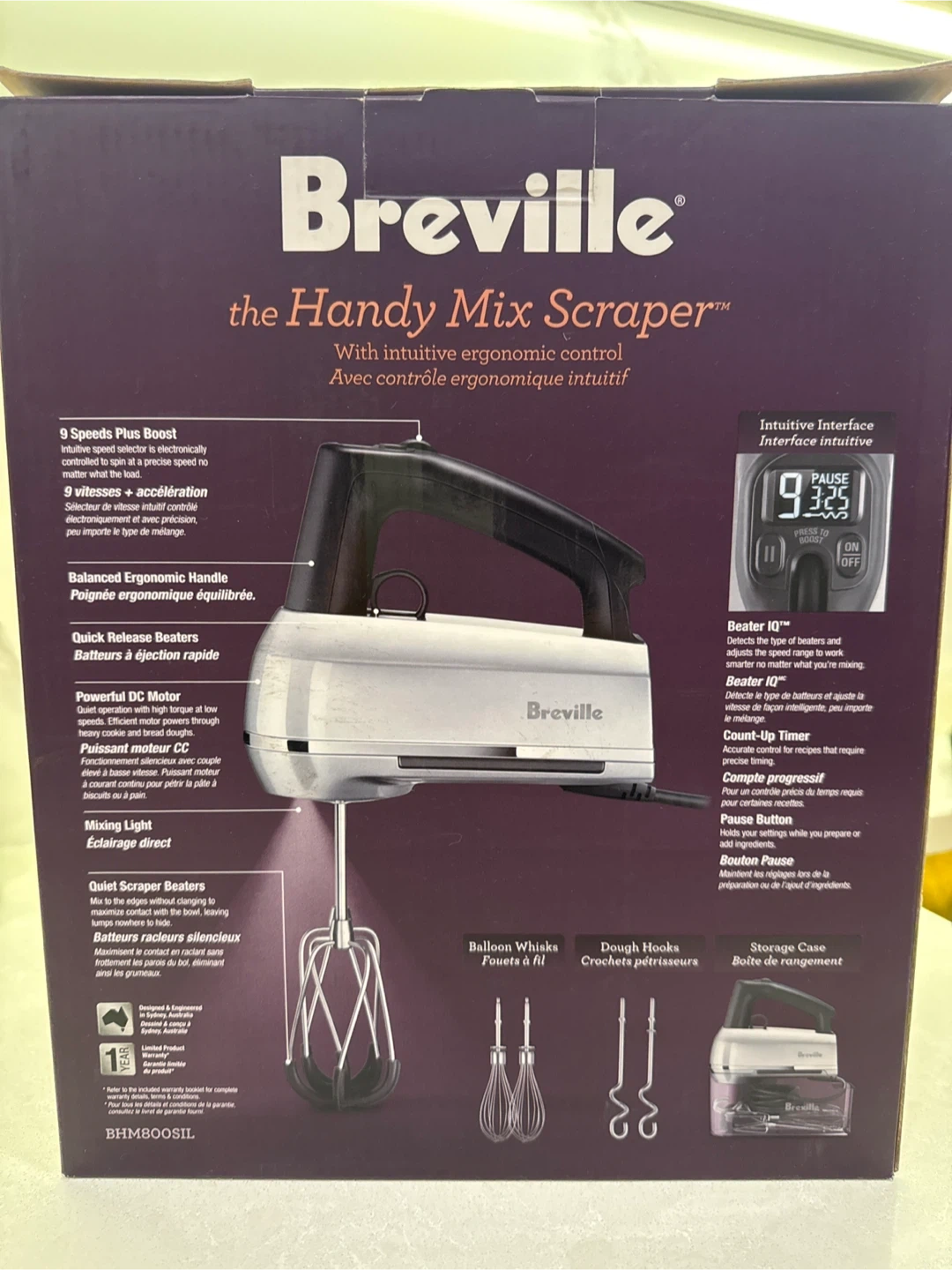 Selling a Breville the Handy Mix Scraper hand mixer! It's in like-new condition and comes with all the original attachments, including the balloon whisks and dough hooks. This mixer has 9 speeds plus a boost function for all your baking needs. It also features an intuitive interface and a balanced ergonomic handle. Comes with the storage case and original box!