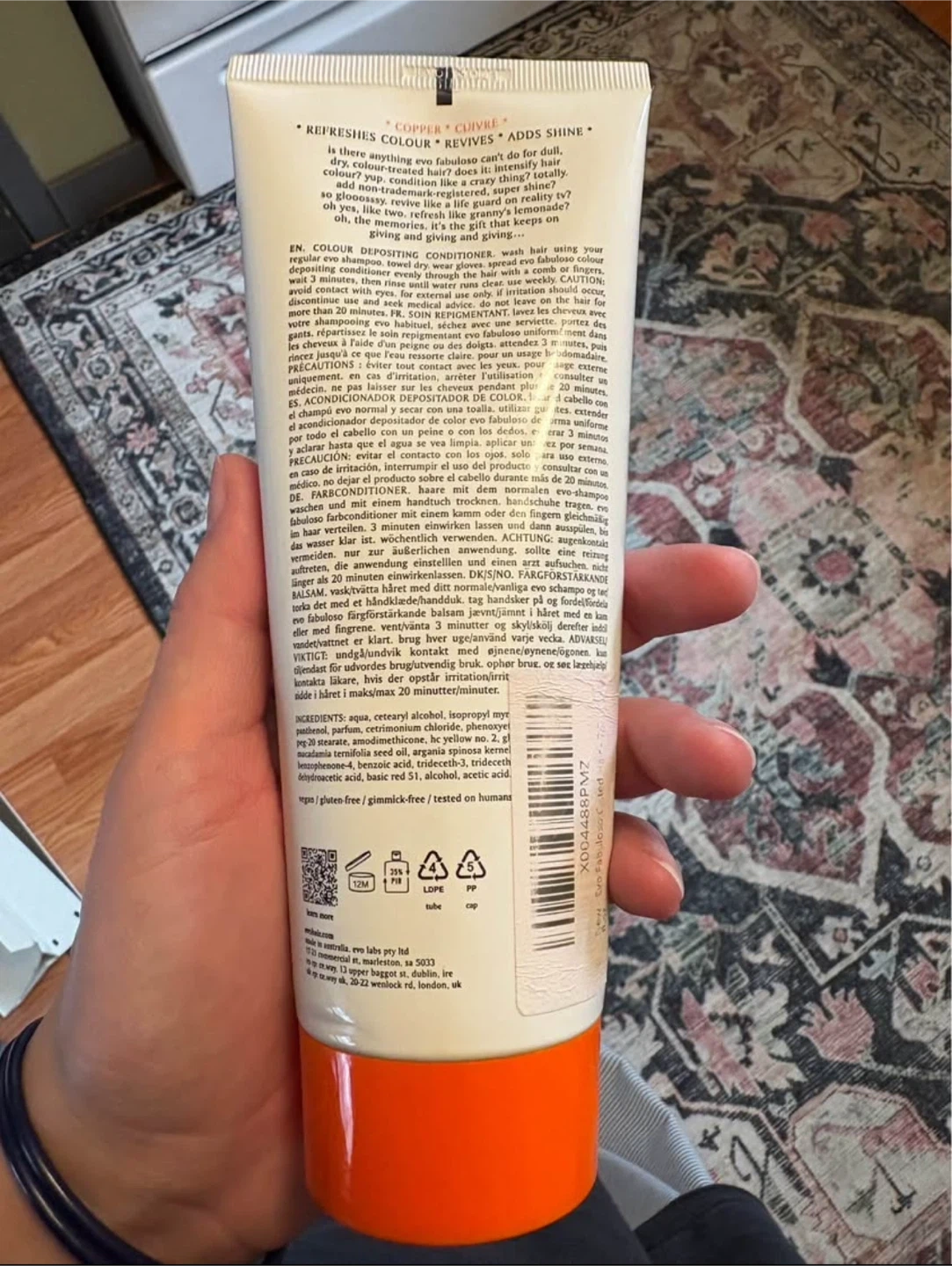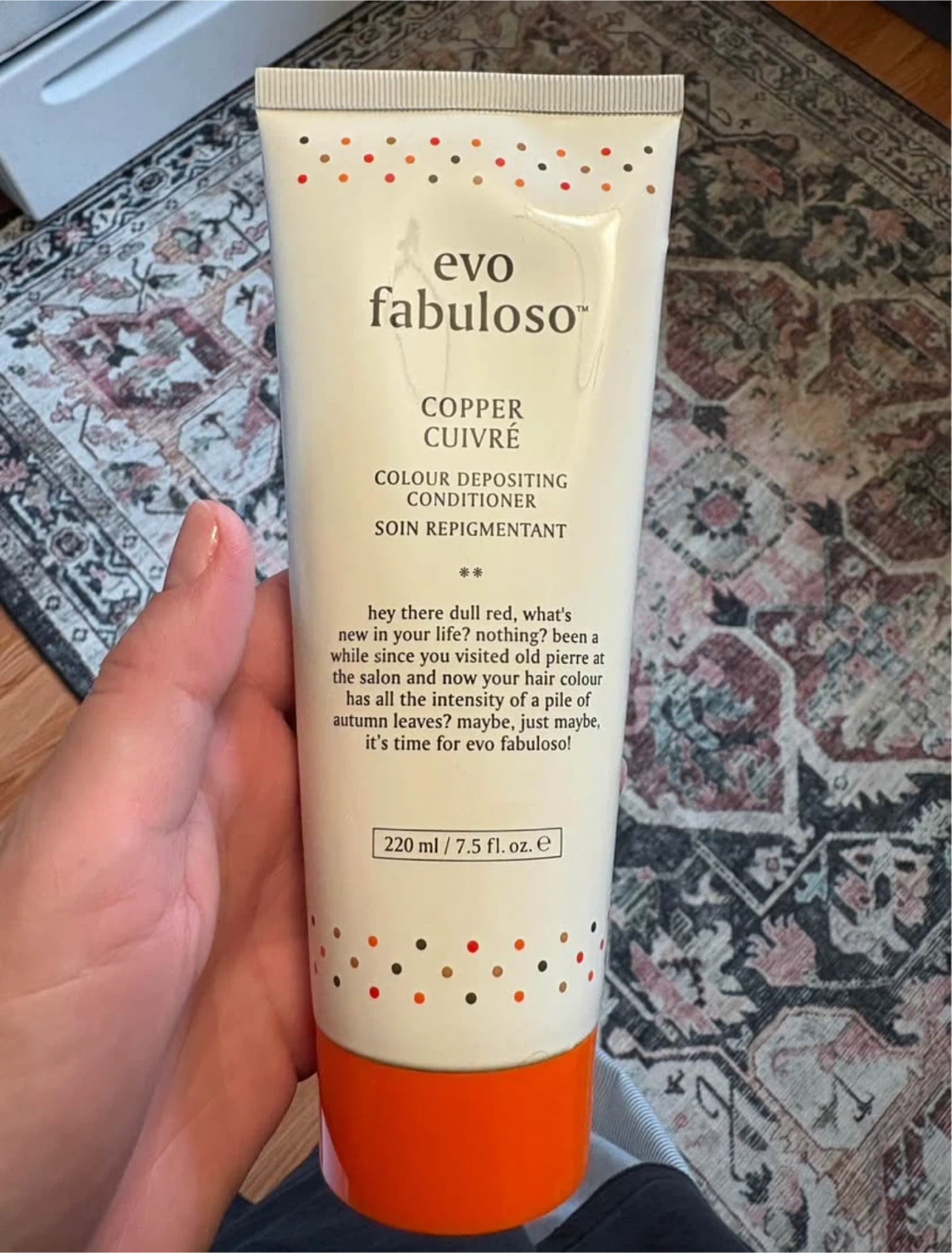 I'm selling a gently used Evo Fabuloso Copper Colour Depositing Conditioner! It's a colour depositing conditioner that refreshes copper and red tones. It comes in a 220 ml / 7.5 fl. oz size.