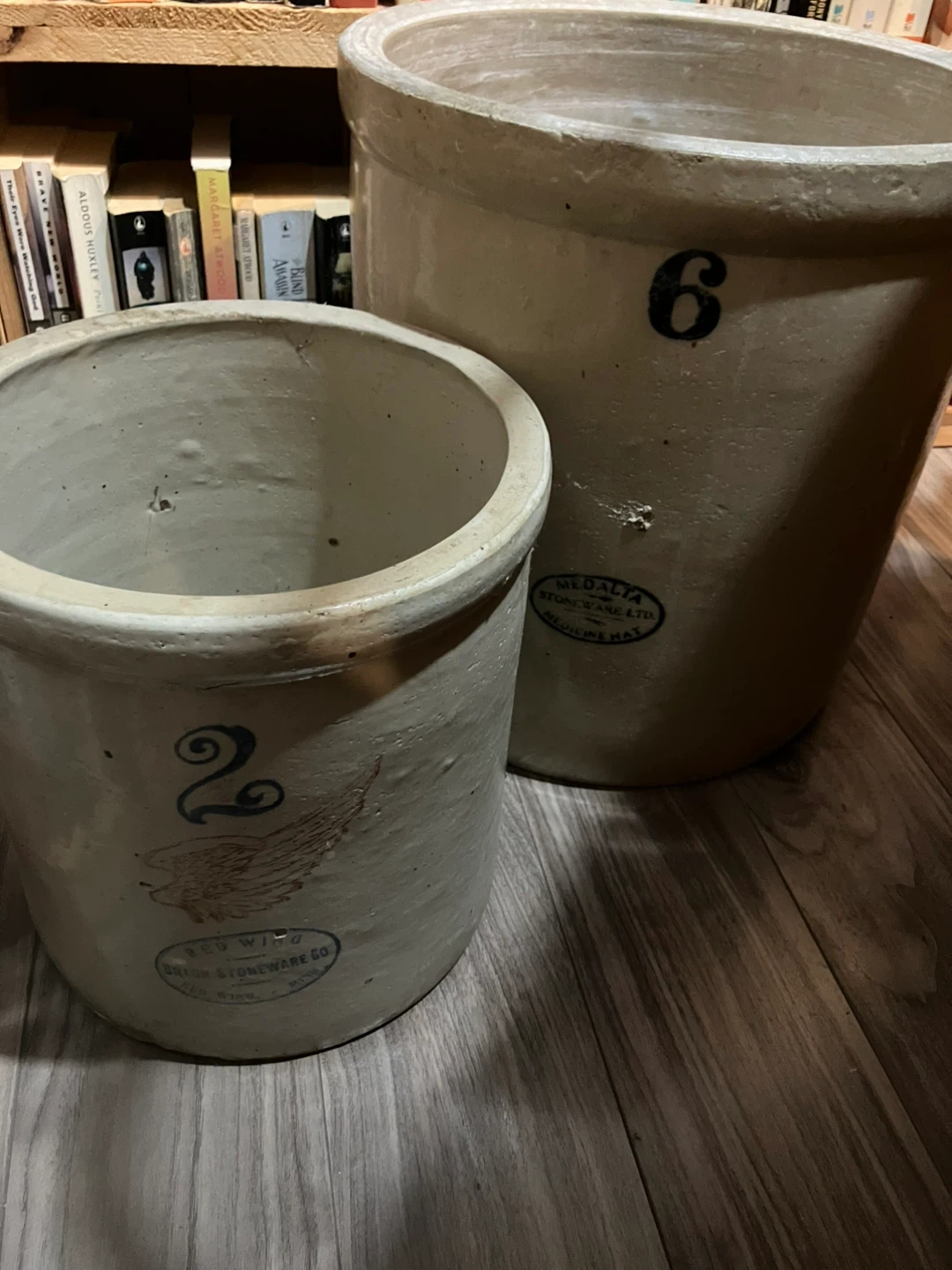 Selling a couple of stoneware crocks. I have a size 6, two size 2’s and a size 1. All are in good condition, no cracks. One of the 2’s has a lid and there are some small chips. Willing to sell individually.