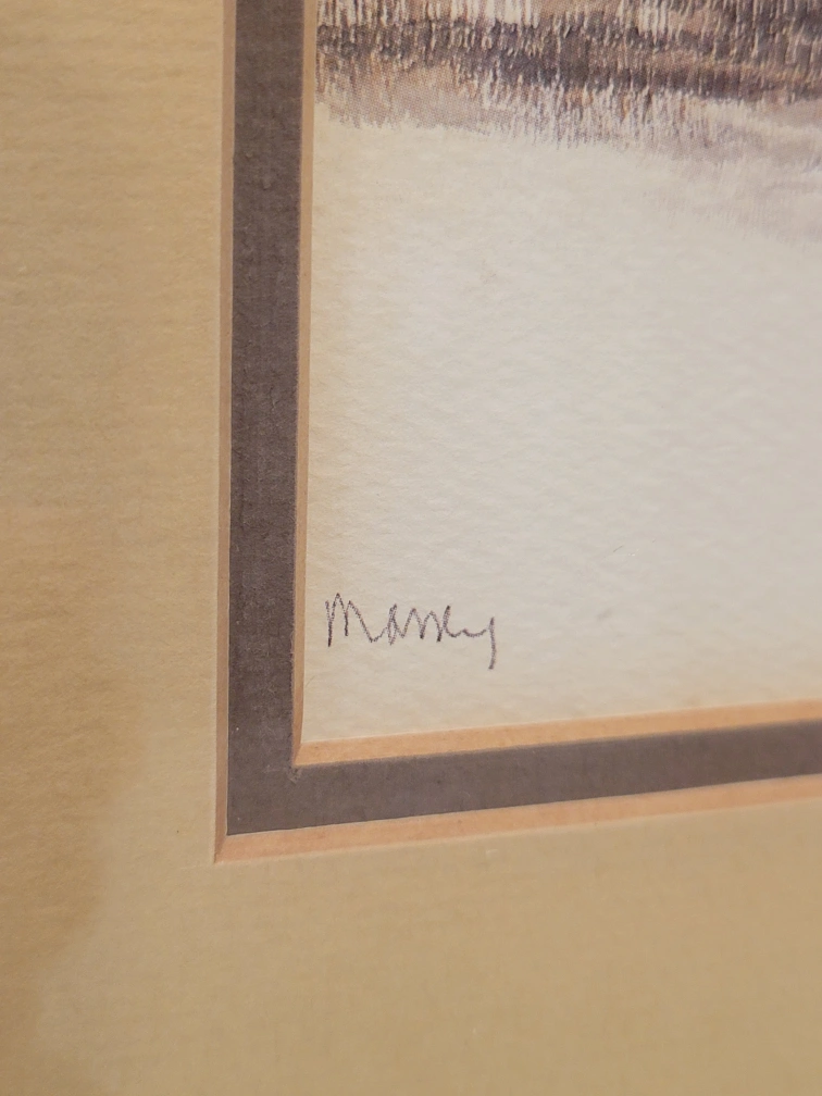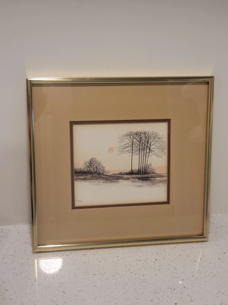 This is an R.A. Massey brass-framed print, showcasing a serene landscape with trees silhouetted against a soft sky, signed by the artist. It is in good condition for its age, with some minor wear to the frame befitting its vintage nature. The print adds a touch of classic elegance to any room.