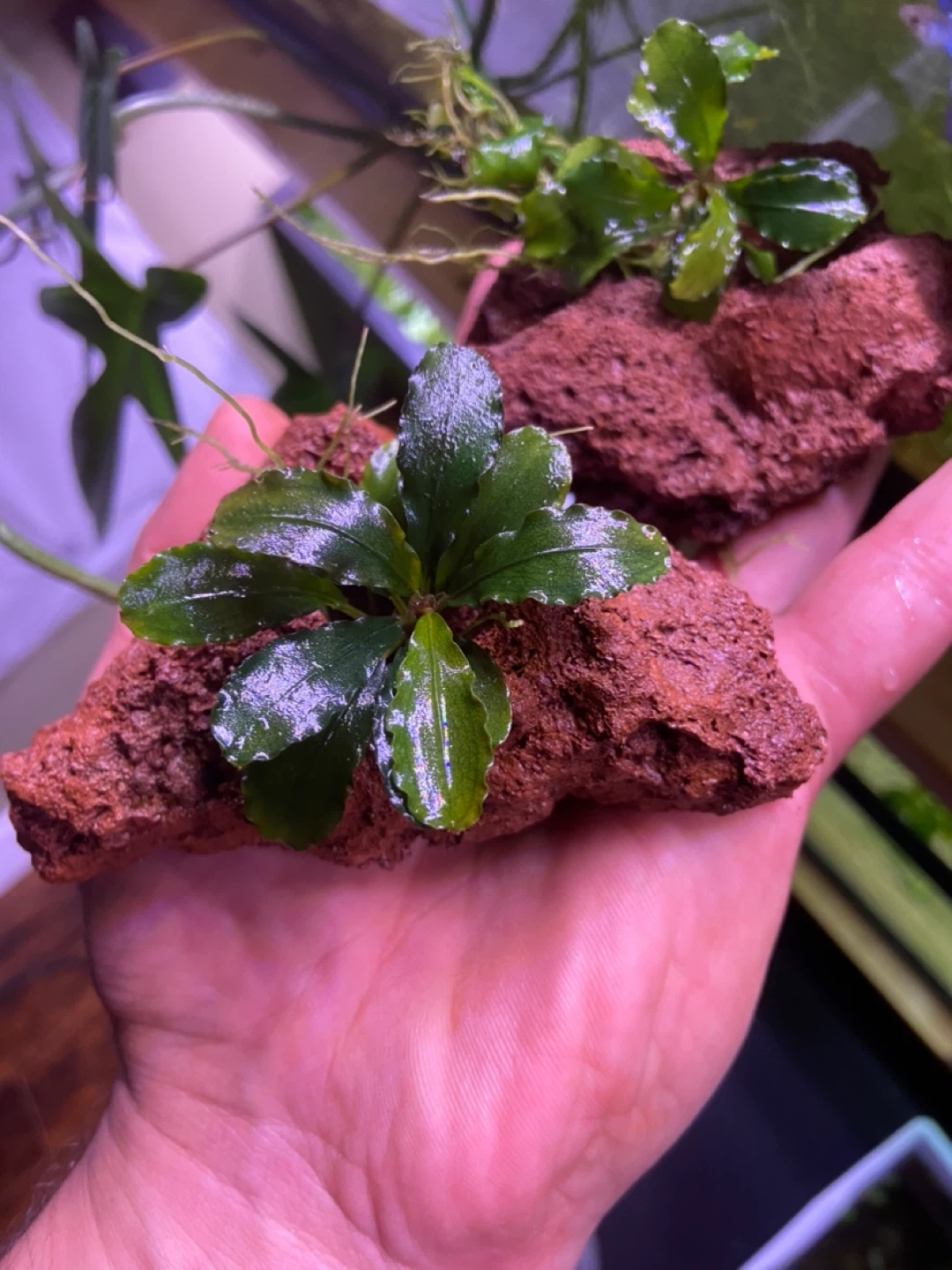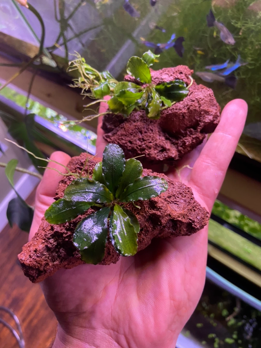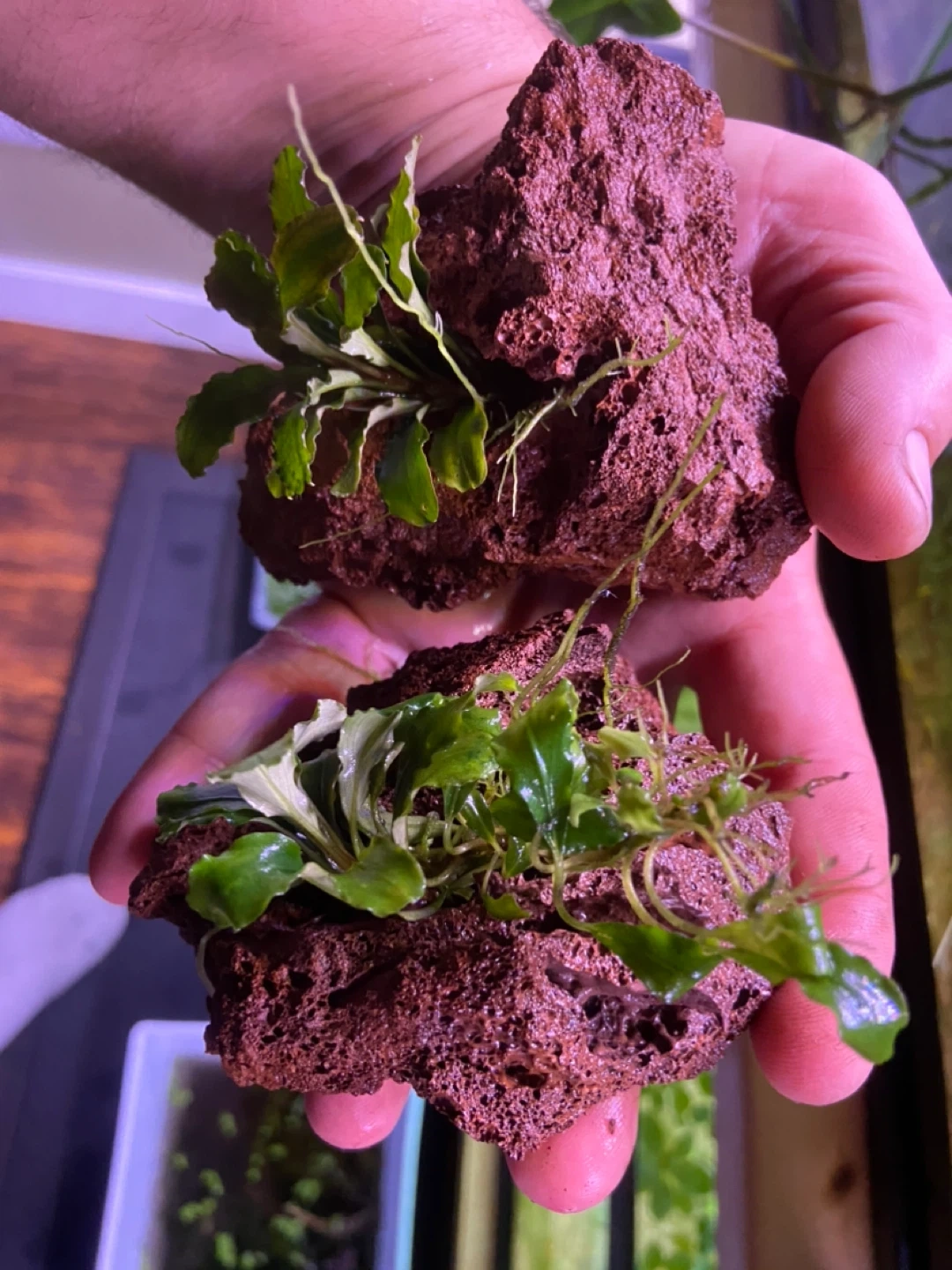 Selling 2 beautiful green wavy Bucephelandra aquarium plants. Attached to lava rock.
