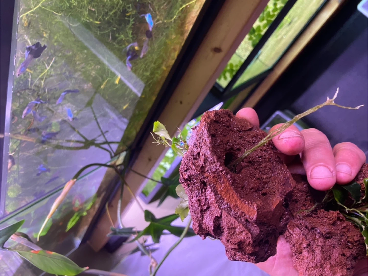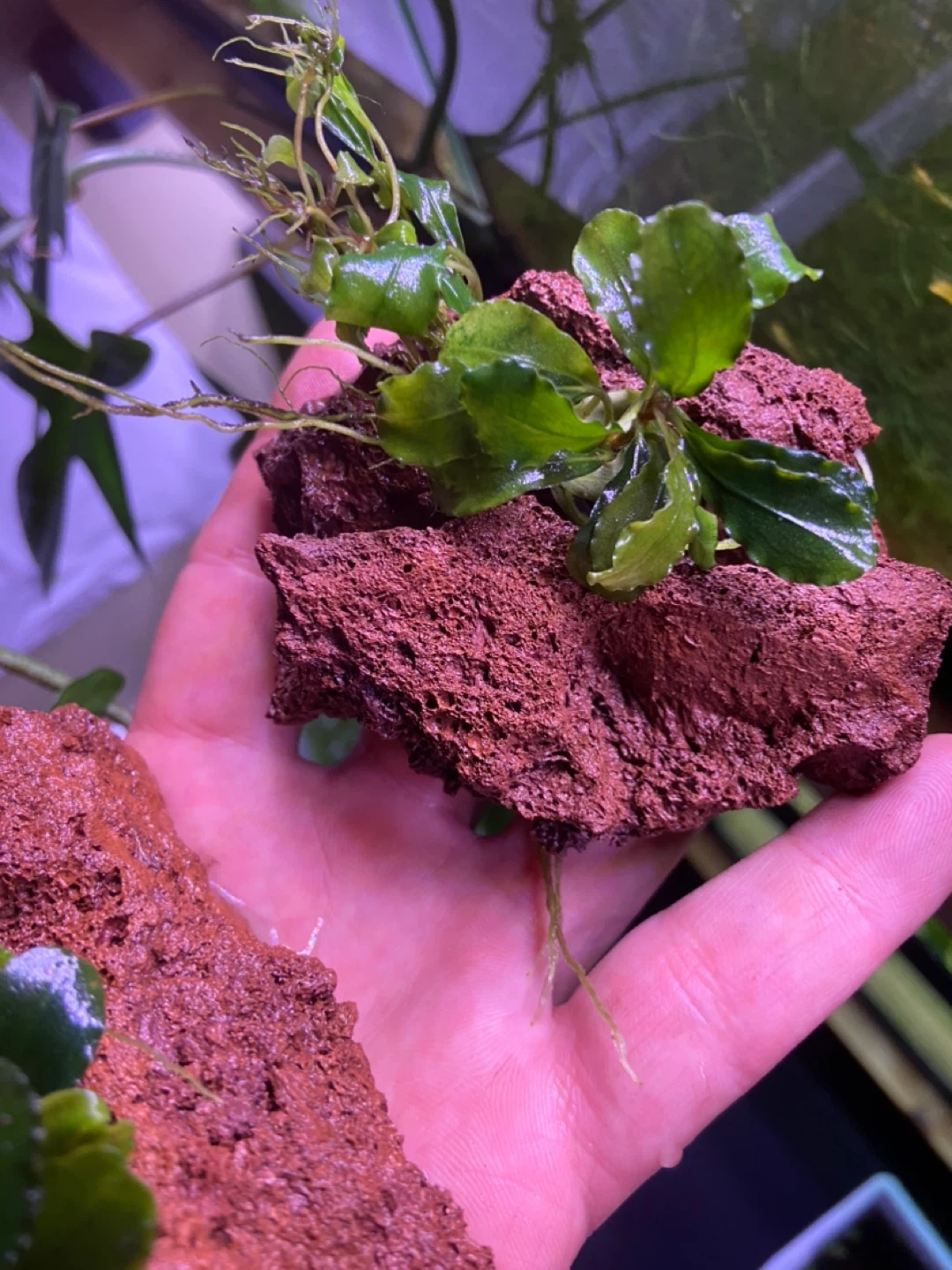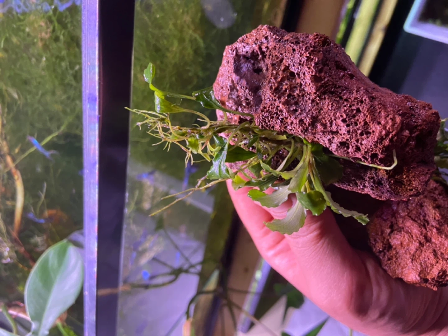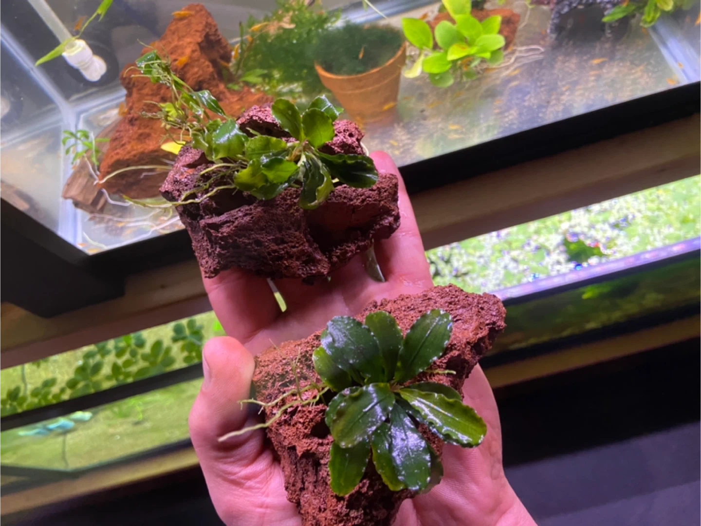 Selling 2 beautiful green wavy Bucephelandra aquarium plants. Attached to lava rock.