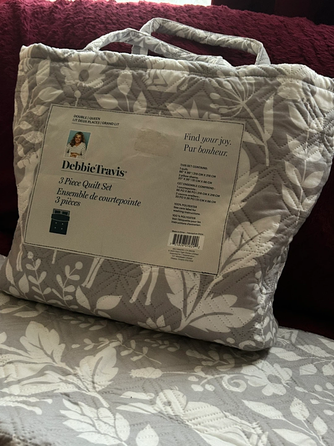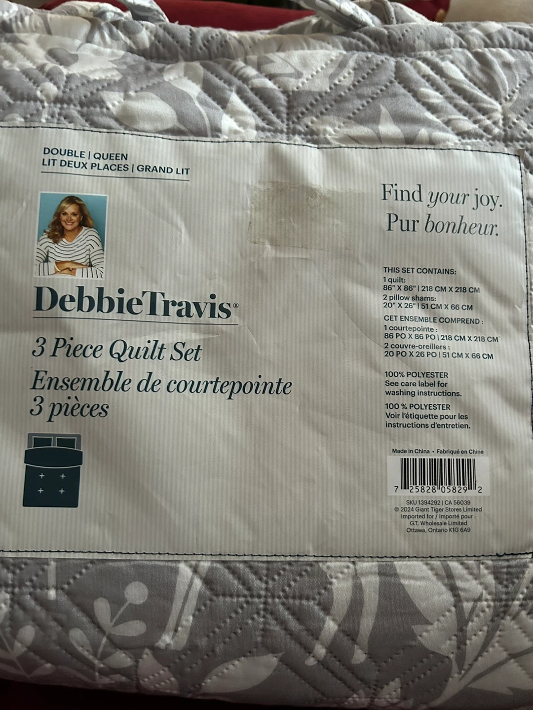This is a Debbie Travis 3-piece quilt set, perfect for a double or queen-sized bed! The set includes one quilt (86" x 86" / 218 cm x 218 cm) and two pillow shams (20" x 26" / 51 cm x 66 cm). It's made of 100% polyester and comes in its original packaging