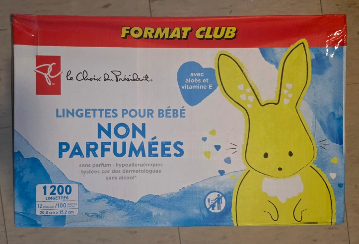 Selling a club size box of President's Choice Unscented Baby Wipes. It contains 12 packs of 100 wipes each, for a total of 1200 wipes. These wipes are fragrance-free, hypoallergenic, dermatologist-tested, and alcohol-free, making them gentle for baby's skin. They also contain aloe and vitamin E