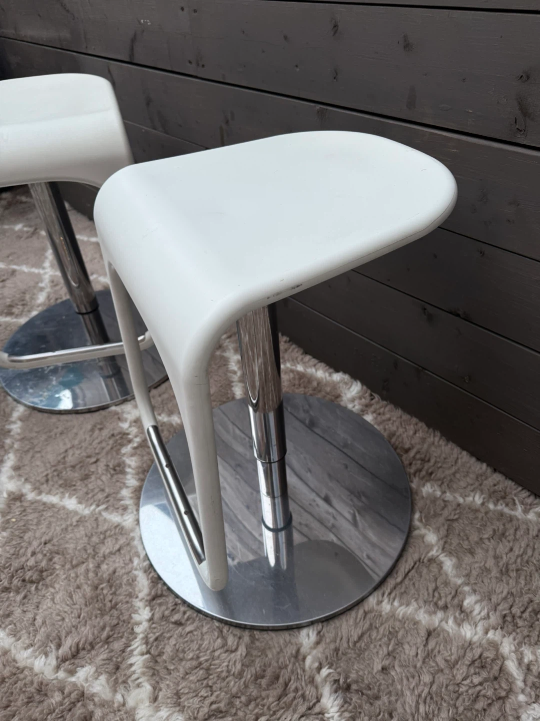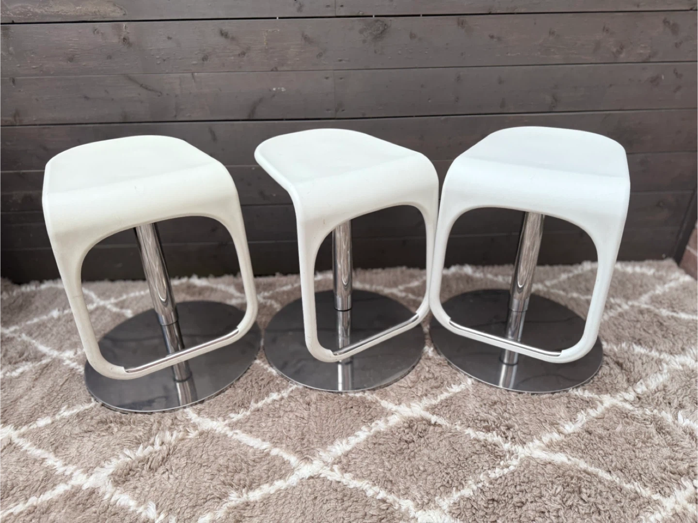 565$30 each ($75 for set/3) -White Swivel counter/bar stools with a very sturdy chrome base. It is in great condition and would be an excellent addition to any kitchen island or bar area! Easy to clean surface. One of the bases has a scratch on it. -Adjustable from 21 1/2” to 29” in seat height.