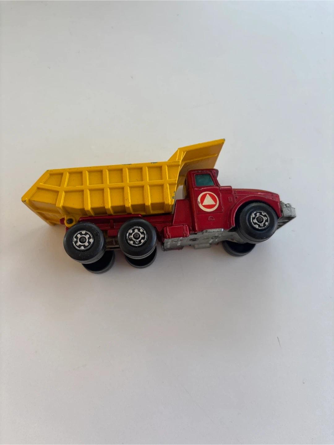 Selling a vintage Matchbox Super Kings Scammell Contractor toy truck! Made in England in 1971, this Lesney Products & Co toy has a yellow dump bed and red cab. It shows some signs of wear due to its age, but it's still a cool piece for any collector