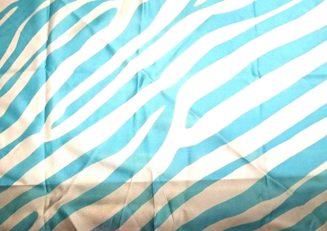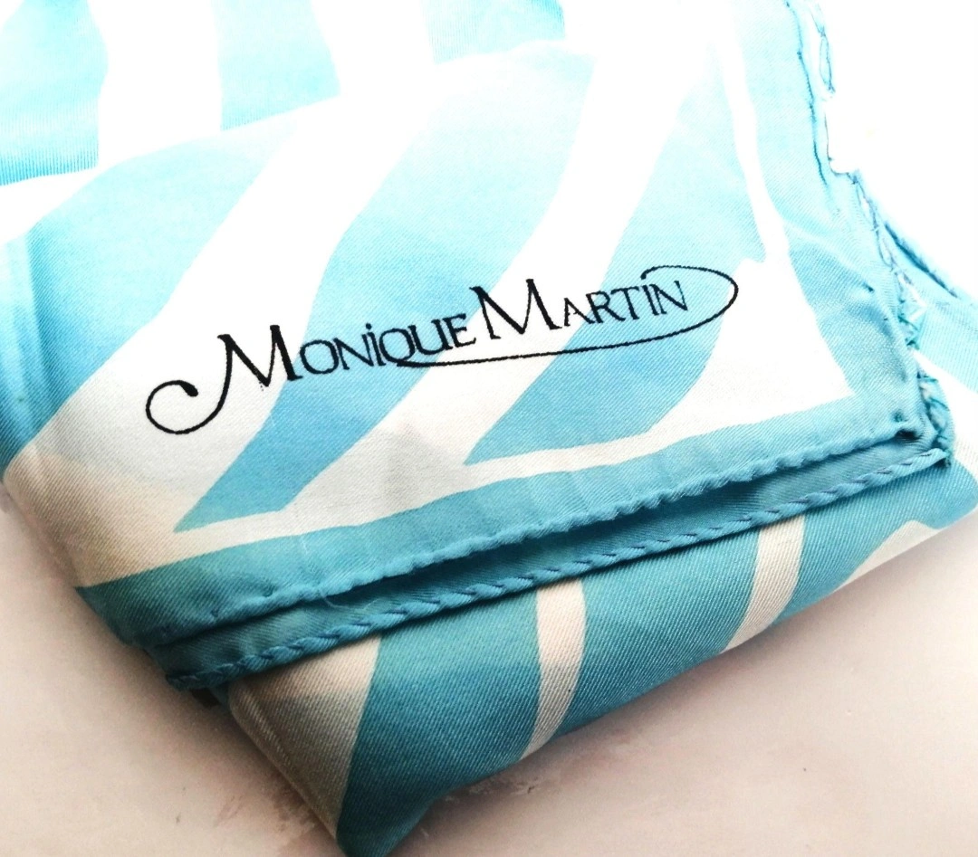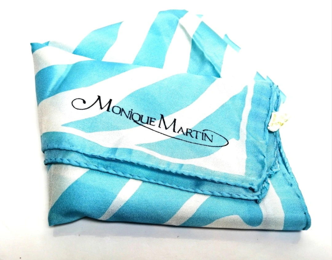 Retro Italian made scarf. Silky polyester blend. Measures approximately 25 inches x 25 inches square. Striped white and sky blue pattern. Hand stitched rim. Good vintage condition. No rips or fading of colour. Excellent retro charm.