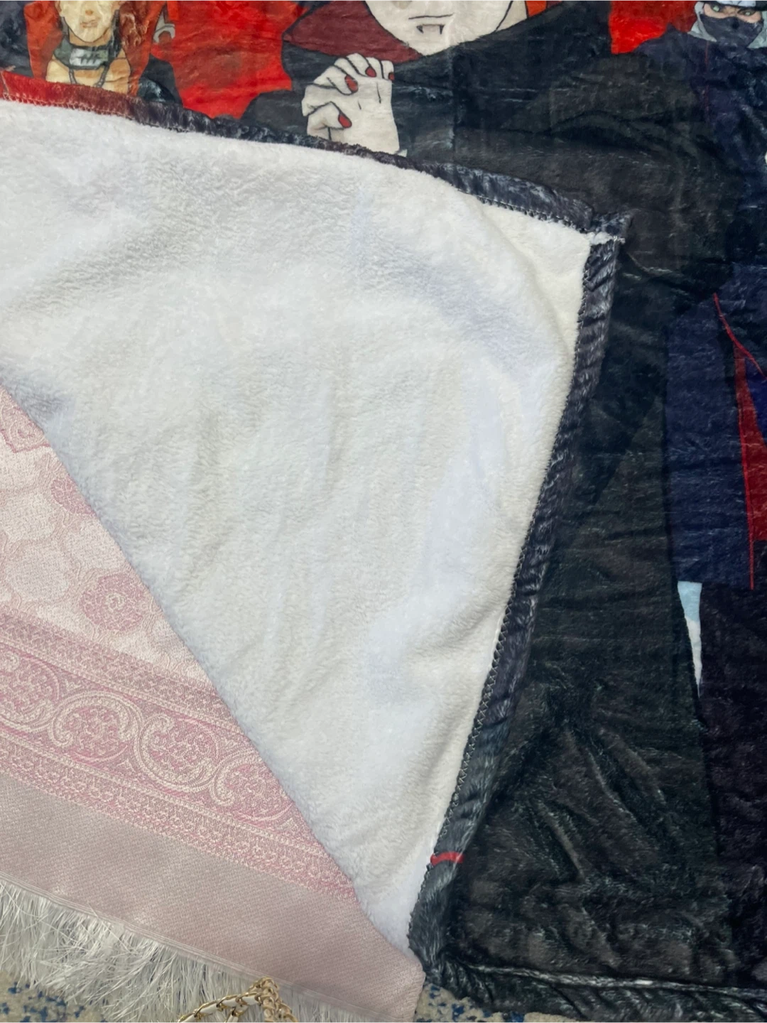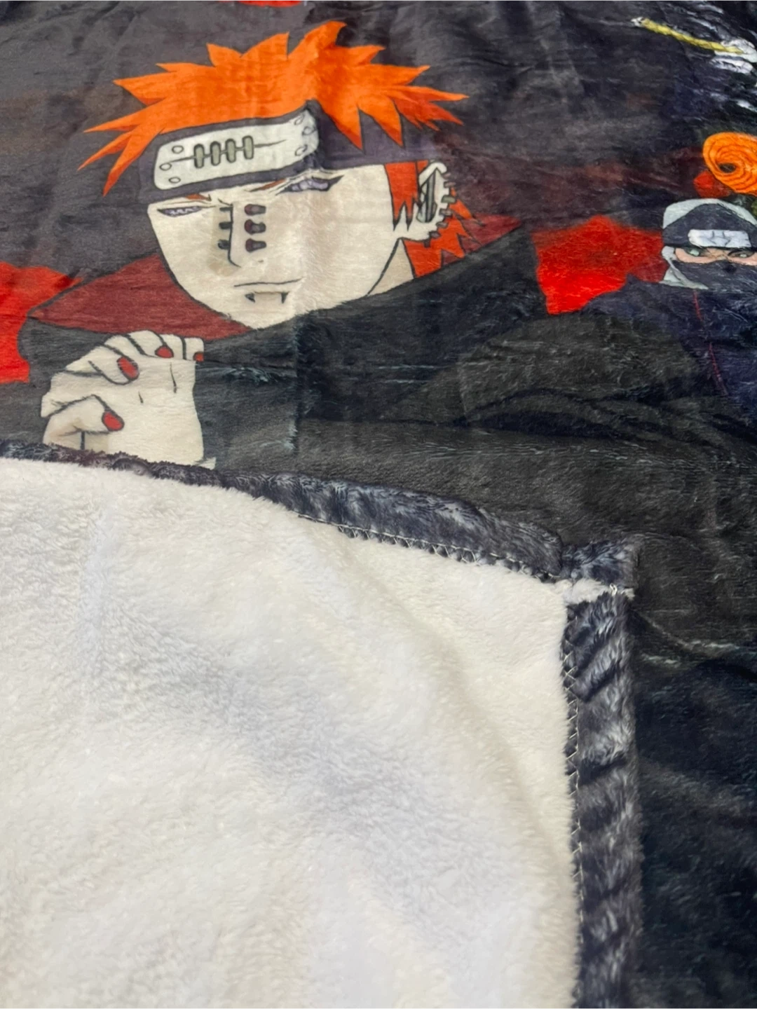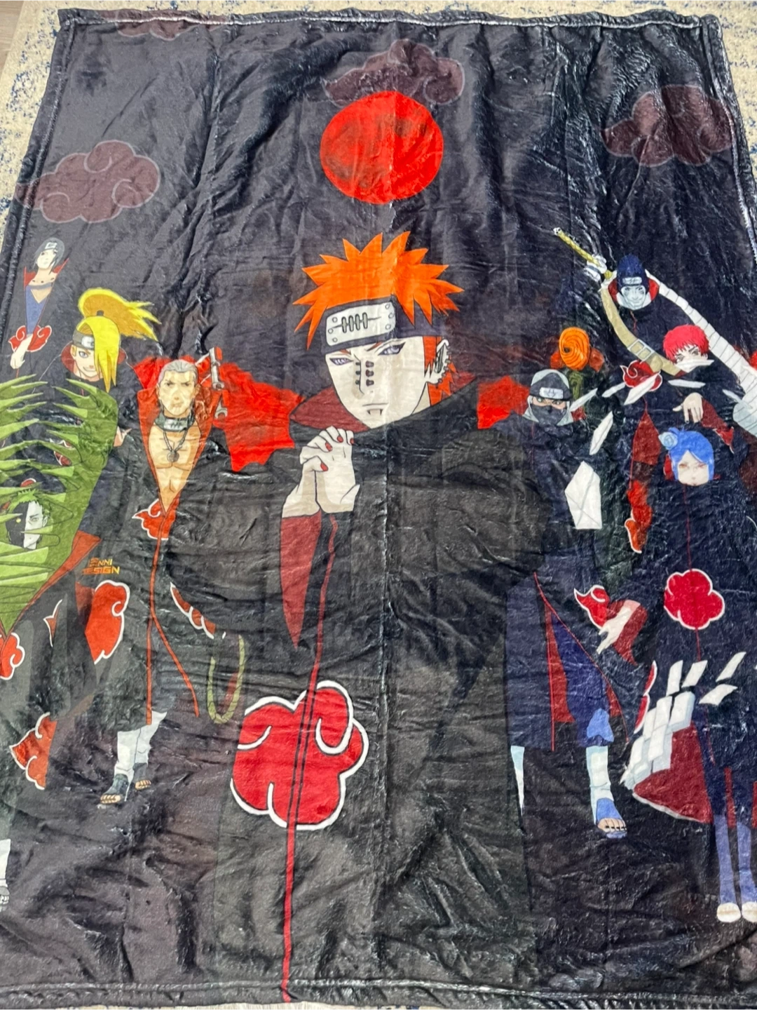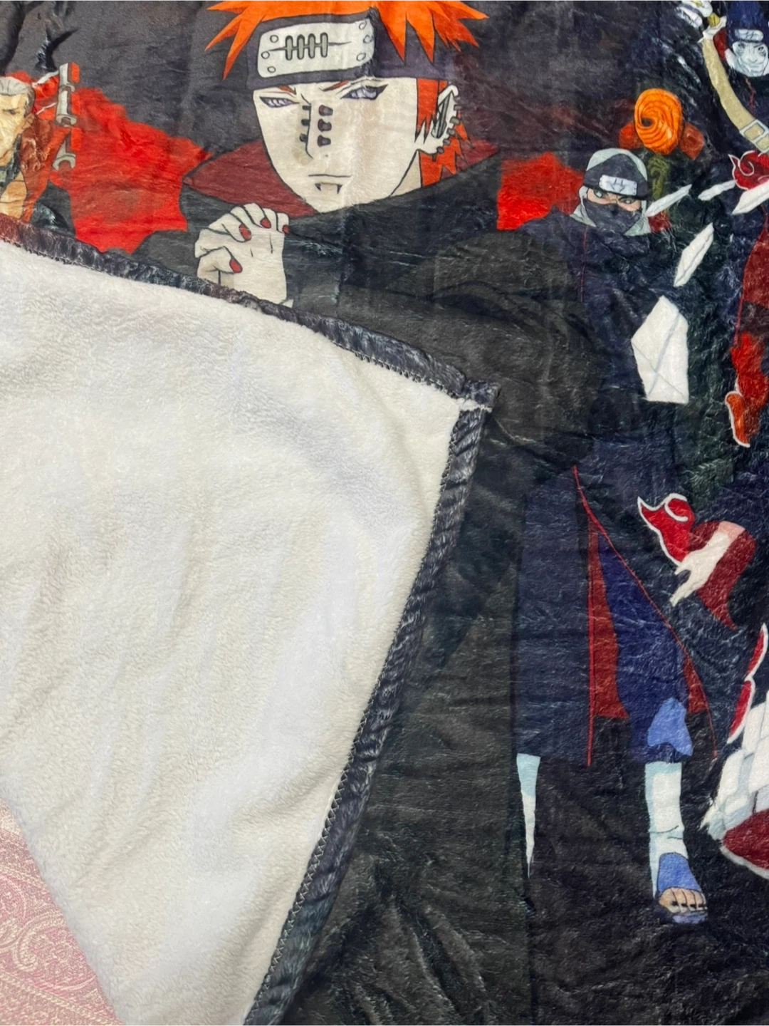 Selling a cozy Naruto Akatsuki anime blanket! It features a vibrant design of the Akatsuki characters on one side and a soft, plush white material on the other. Perfect for any Naruto fan to snuggle up with!