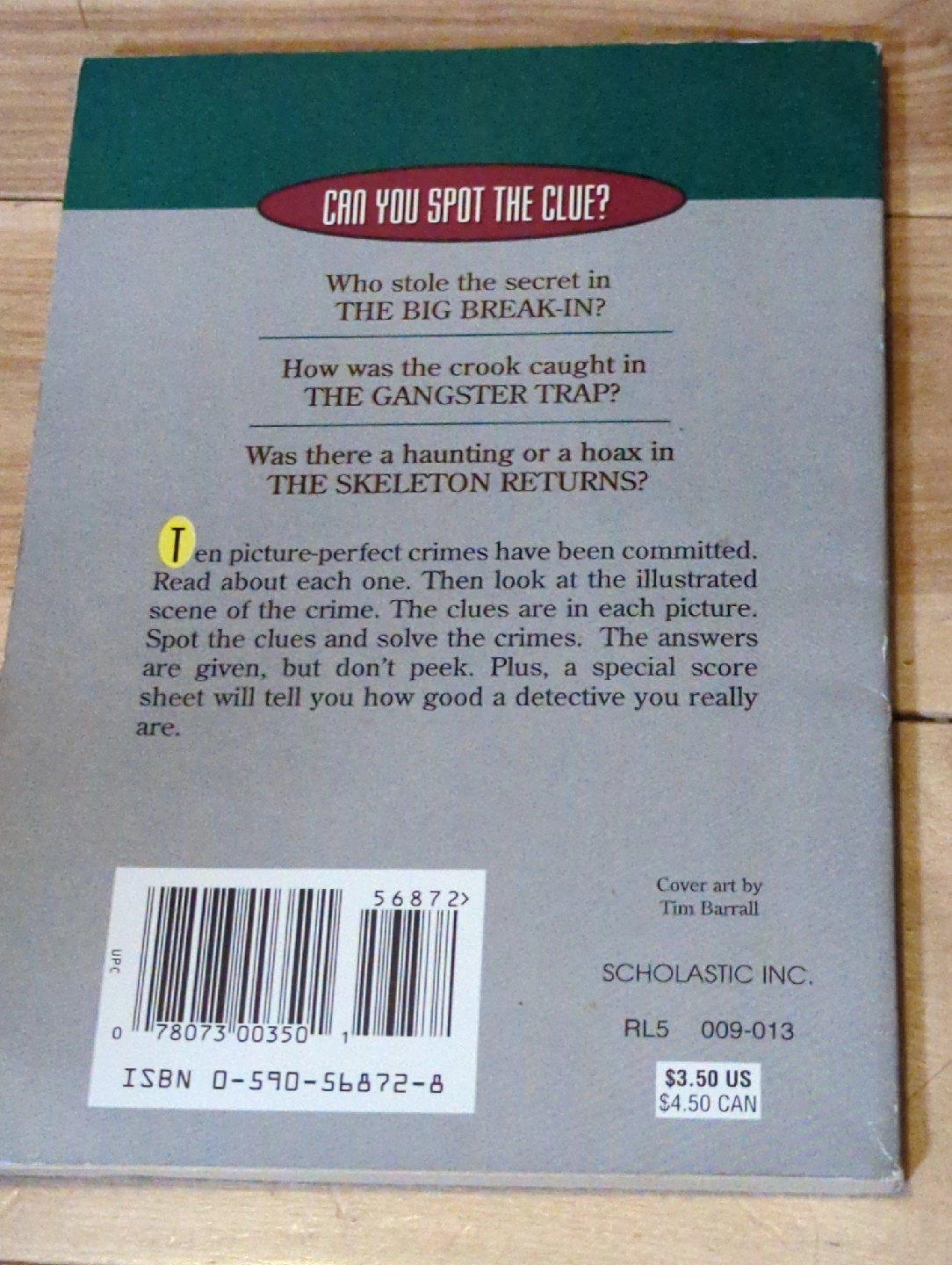 The book "The Skeleton Returns" by Marvin Miller. It's a ten picture mysteries book where you spot the clues and solve the crimes. The answers are given, but don't peek!