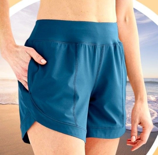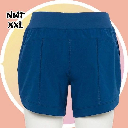 Size XXL. Dark Teal Blue. Breathable Fabric. Curved Sides Stitching adds flare leading to Curved Hemline creating a streamlined look easier leg movement for activities. 2 Side Seam Functional Pockets. 5-in. inseam. Double Stitch down center leg for style. Curves Stitched Seam across upper back For a more flattering look. Wide Elastic Waistband won't roll down. Polyester, spandex. Machine wash.