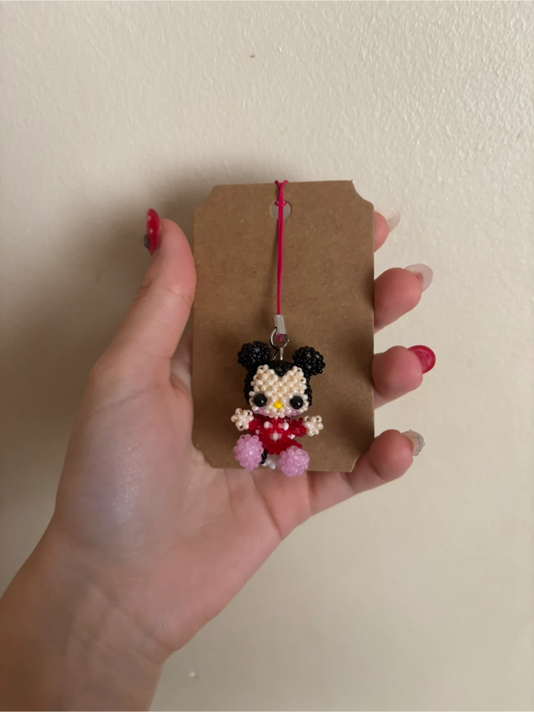 Super cute Minnie Mouse charm made of tiny beads! The colours are red, pink, black and white. Perfect for a bag or phone accessory