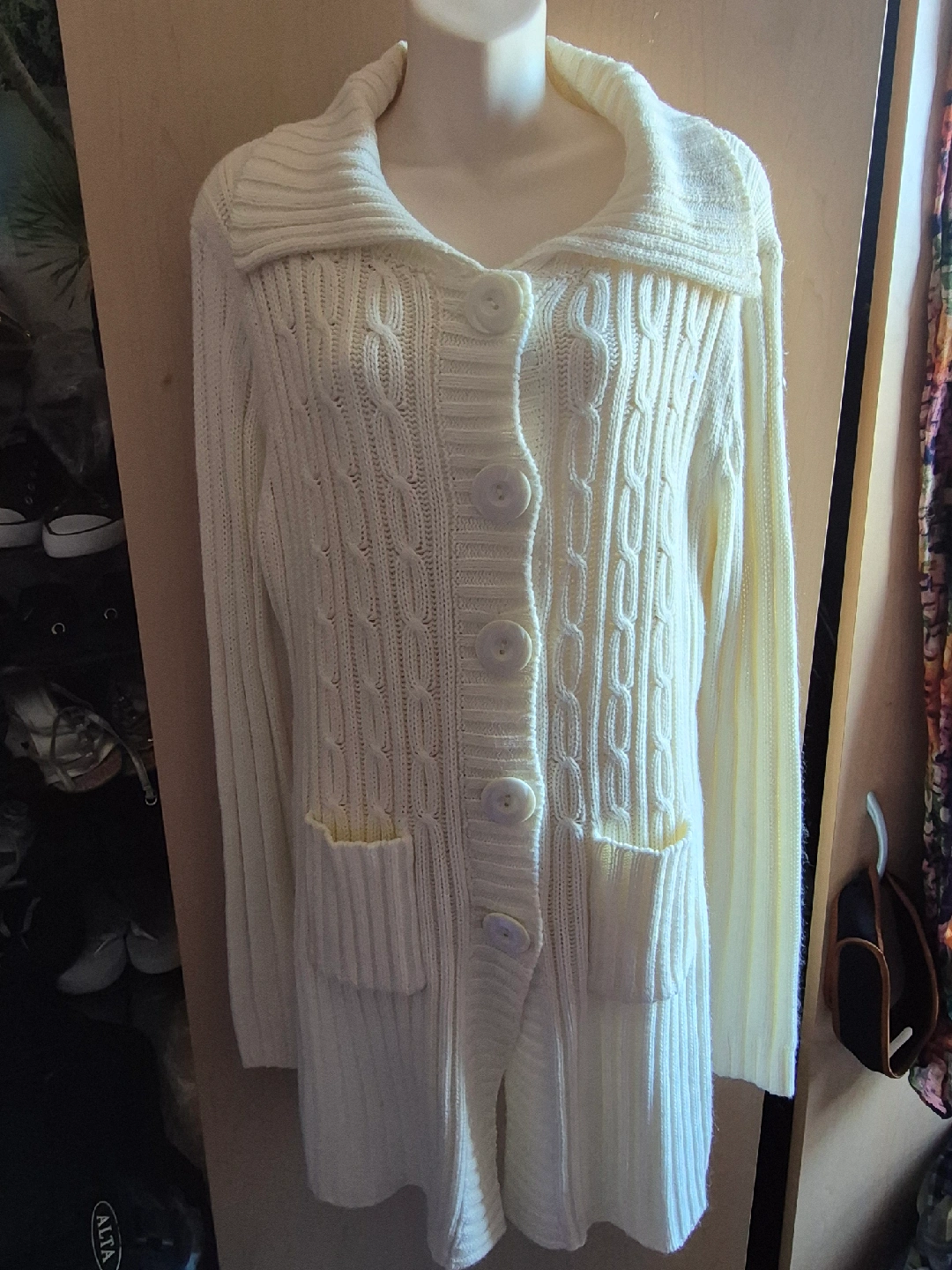Cozy up in this cream-coloured cable knit cardigan! It features a collared neckline, button-up closure, and two front pockets. Perfect for layering on chilly days!