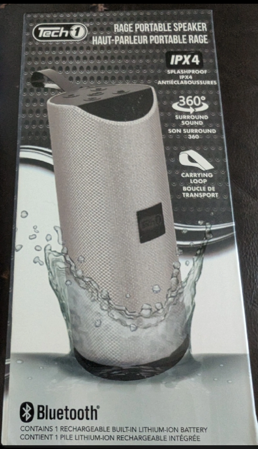 Selling a Tech 1 Rage portable speaker. It's splashproof with an IPX4 rating, so it's great for outdoor use. It features 360° surround sound and a convenient carrying loop! Contains 1 rechargeable built-in lithium-ion battery