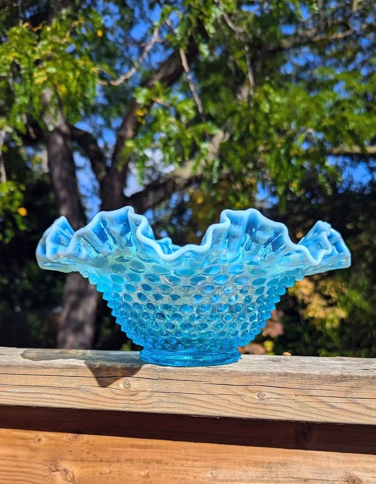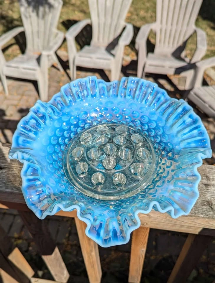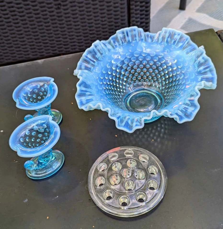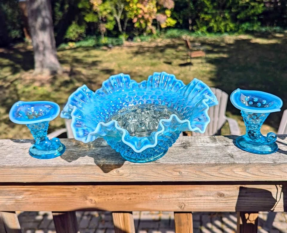 β¨ 1 large ruffled edge centerpiece bowl (approx 9inch diameter, 5 inch height) β¨ 2 matching cornucopia vases (3.5 inch height) β¨ 1 glass flower frog insert (5 inch diameter, 16 insert holes) The soft gradient from aqua blue to milky opalescent edges catches the light beautifully, creating a timeless and ethereal glow. Perfect for a vintage-inspired home, cottagecore decor, or as a unique centerpiece for weddings and special events. π©΅ Condition: Excellent vintage condition β no chips or cracks noted.