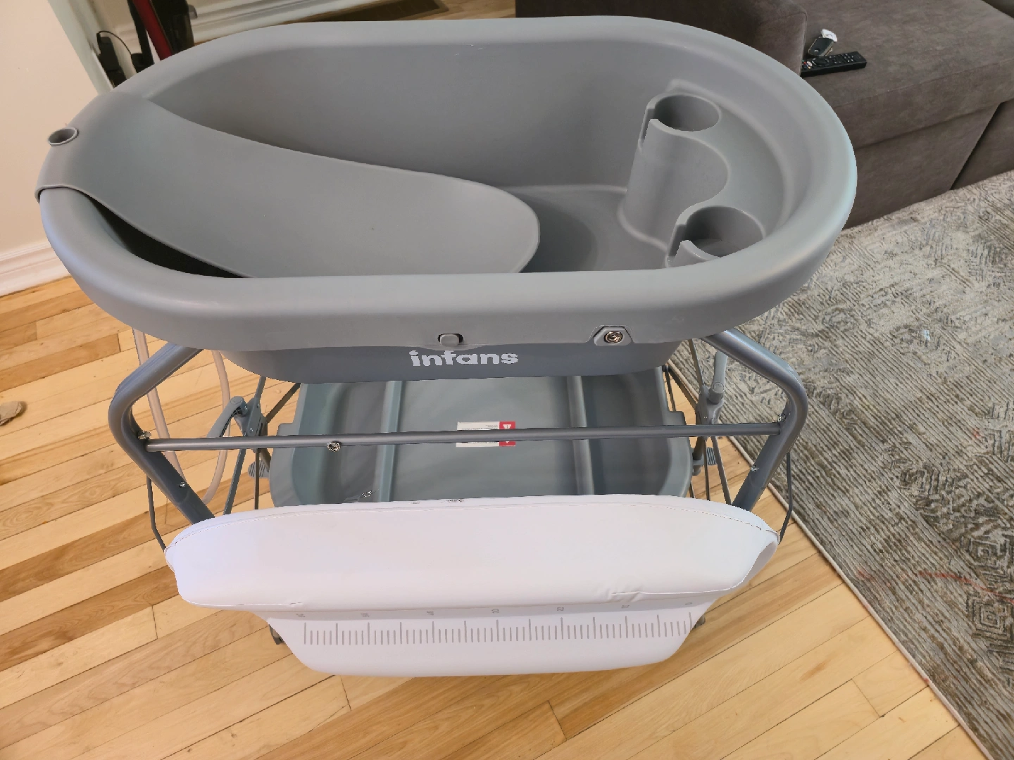 Selling a rarely used Infans baby bathtub and changing table combo! It's in great condition and features a convenient design for bathing and changing your little one. The changing pad has a cute elephant design. Perfect for saving space and making bath time easier!