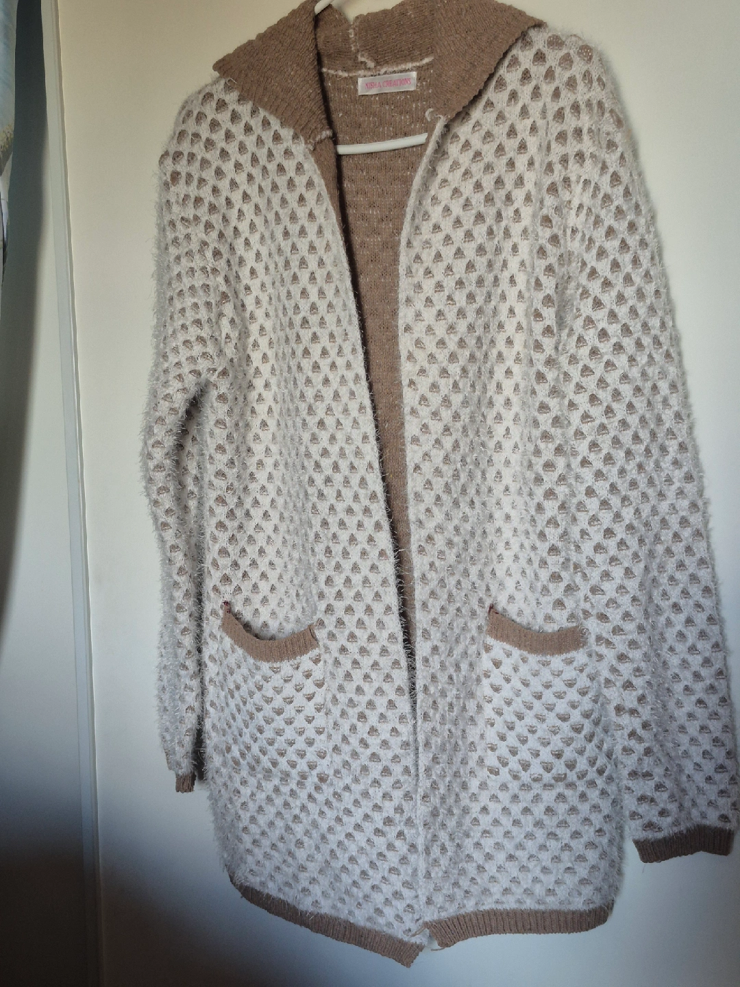 Cozy up with this lovely cardigan from Nisha Creations! It features a unique textured pattern and a comfortable hood. Perfect for adding a touch of warmth and style to any outfit