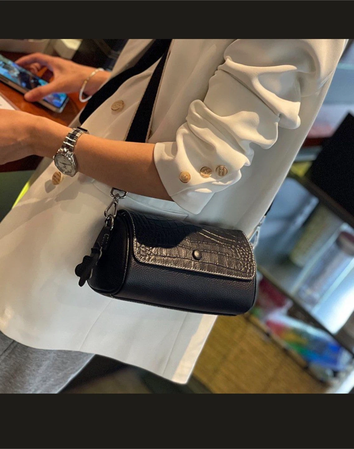 This is a stylish black barrel bag with a croc-embossed pattern. It's a versatile piece that can be dressed up or down. The bag comes with a box, making it great for storage or gifting. It features a detachable strap and silver-tone hardware.