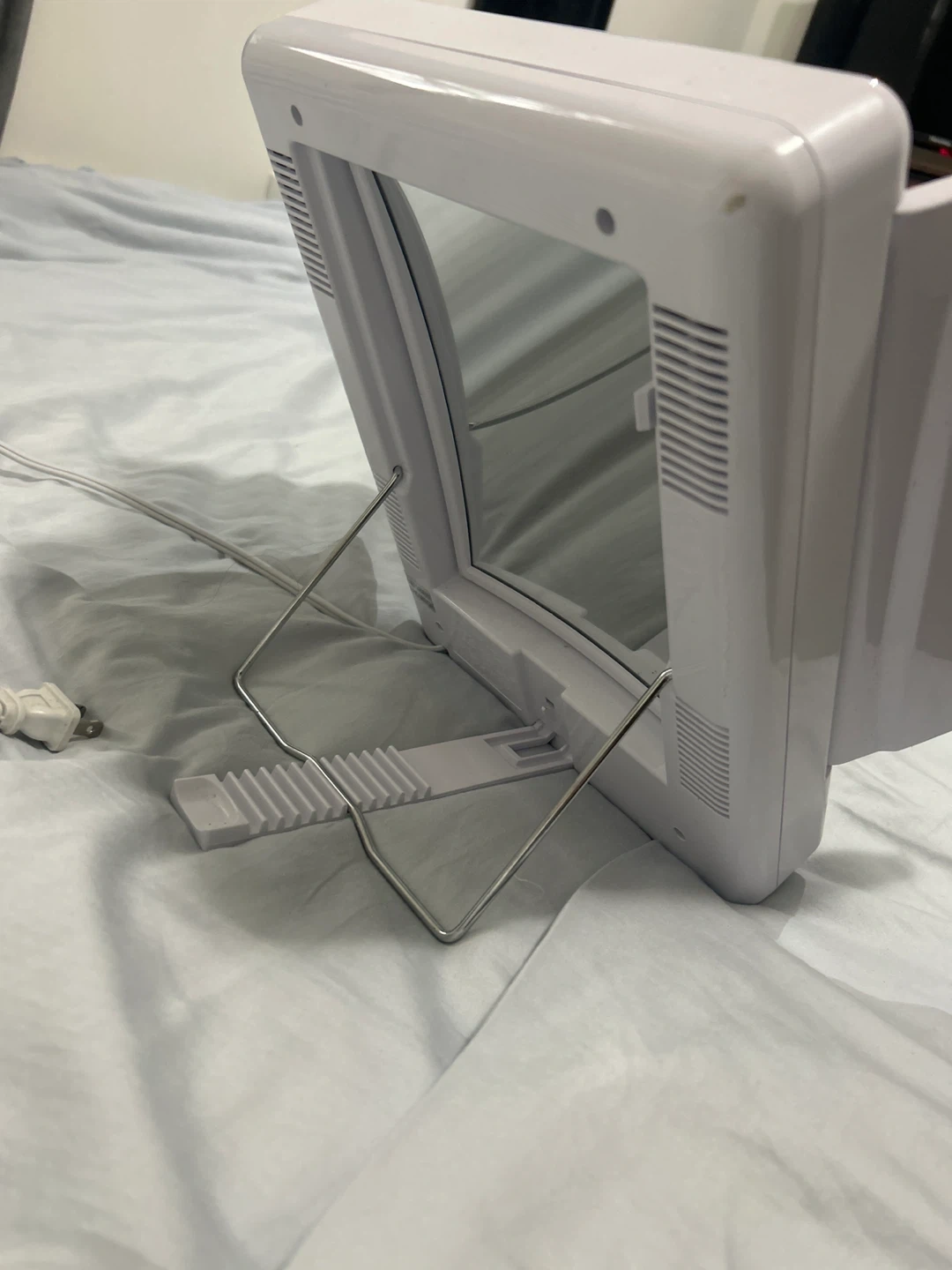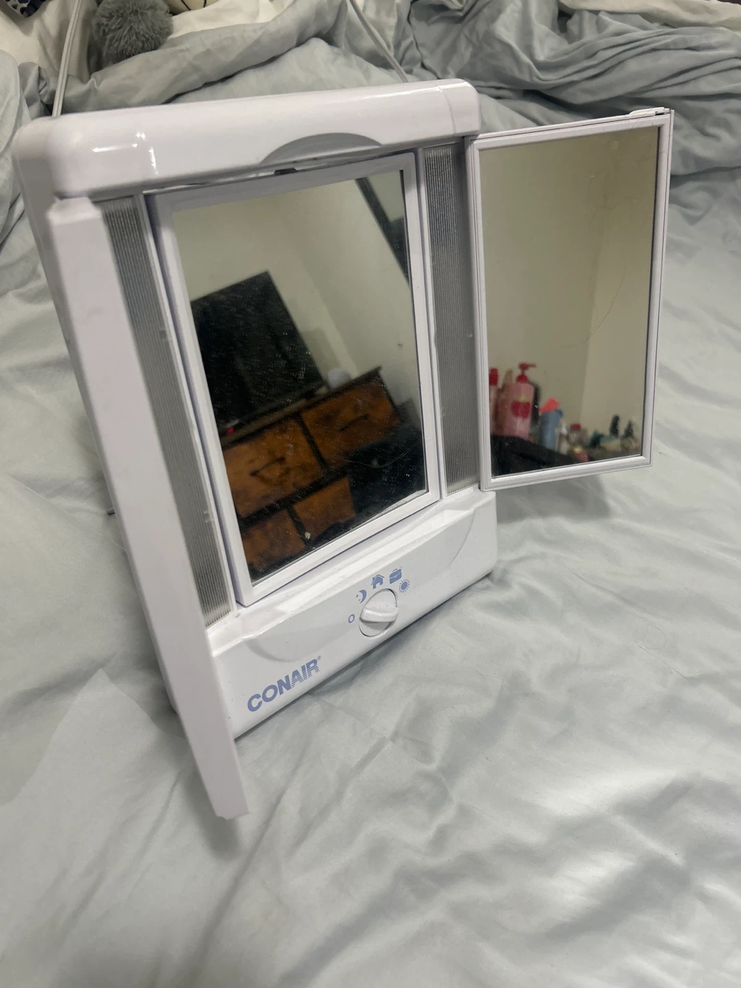 Selling a Conair tri-fold lighted makeup mirror! It's in great shape and perfect for getting ready. The tri-fold design gives you a great view, and the lights make it easy to see everything clearly. A great addition to any vanity or bathroom