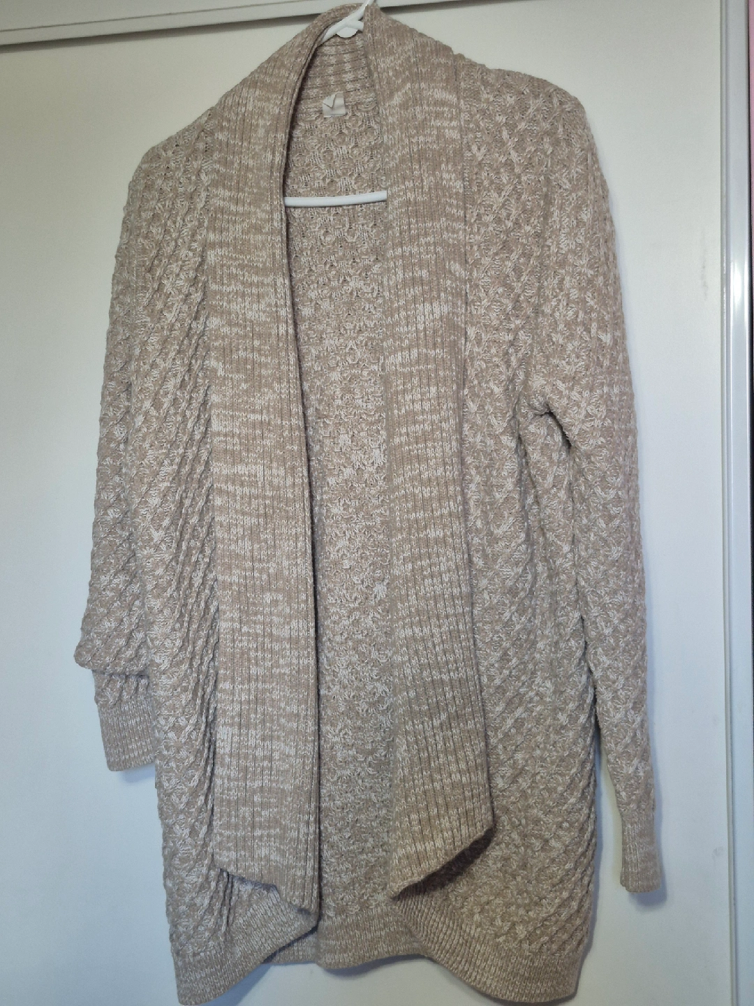 Selling a cozy tan knit cardigan. It's in great condition and perfect for layering on cooler days. The open-front design makes it easy to wear with anything. It's a comfortable and stylish addition to any wardrobe