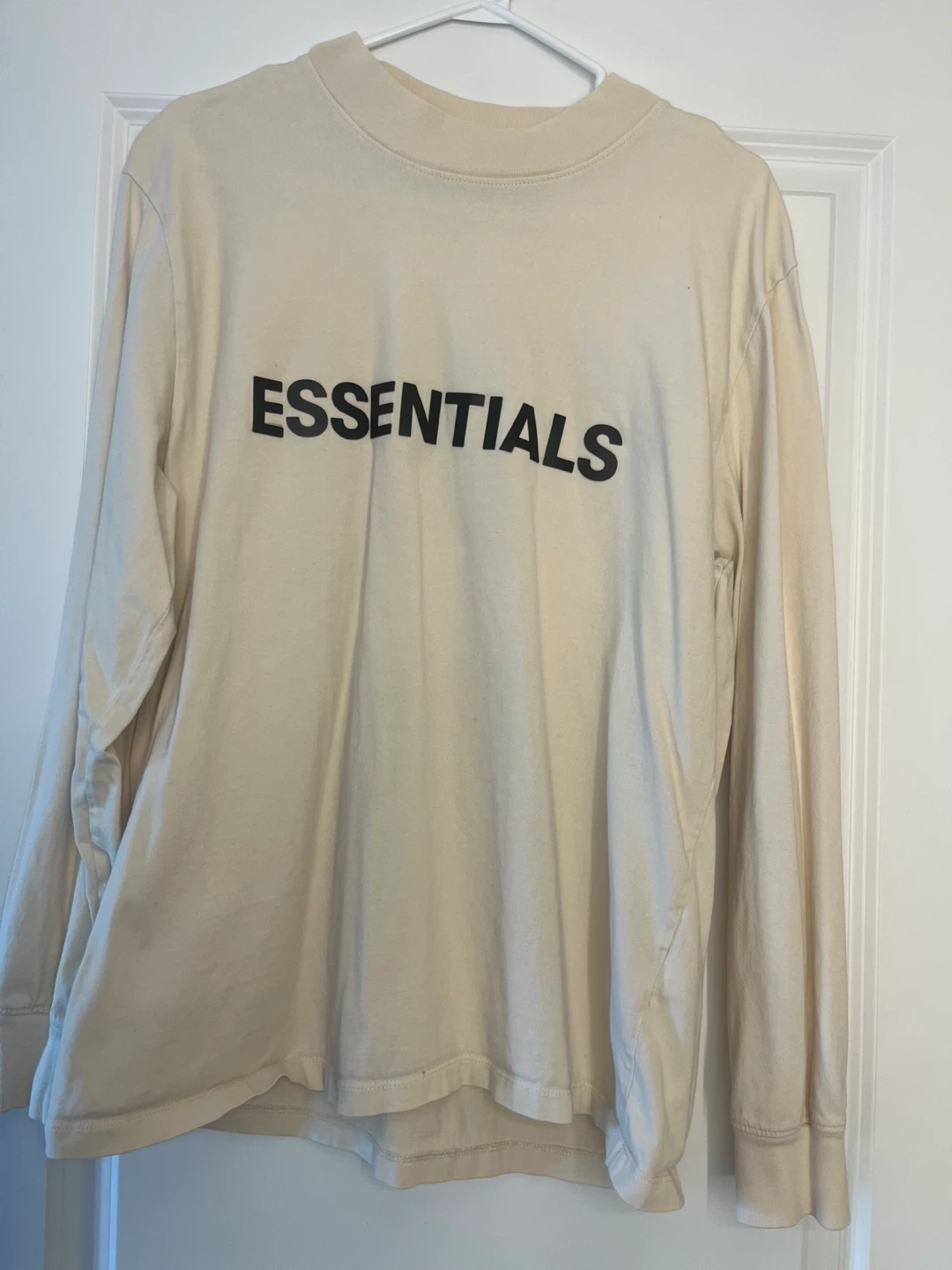 The shirt is a cream colour with the Essentials logo printed on the front. Perfect for casual wear!