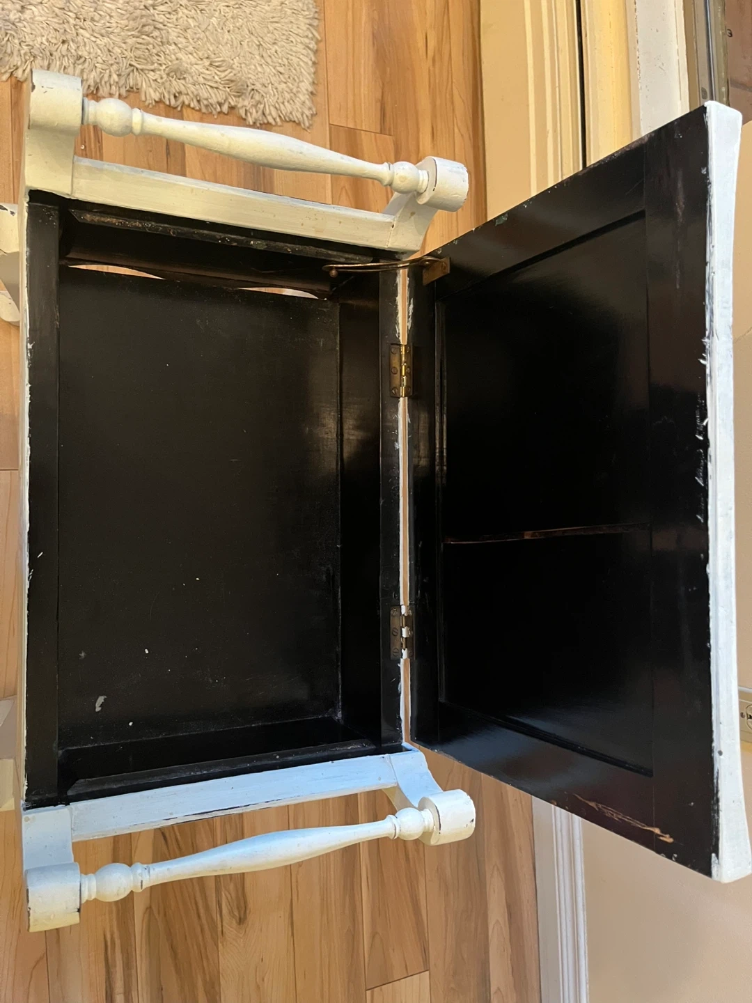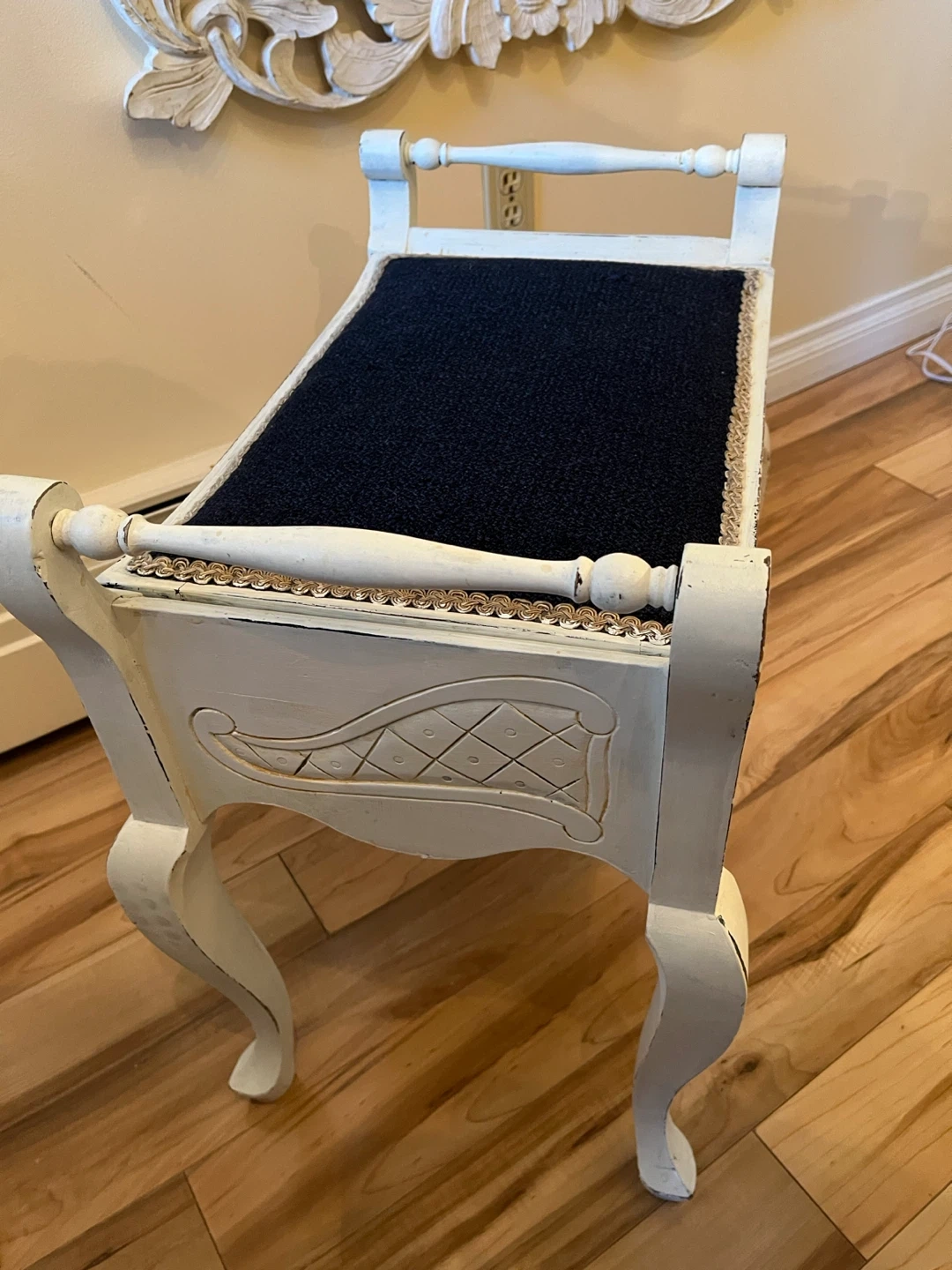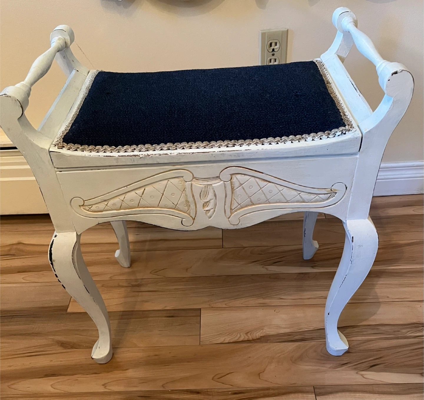 Antique piano bench from the Edwardian era, 1905. Solid wood, very sturdy, I believe it’s mahogany. Painted and sanded edges when shabby chic was in so it could use some love. Decorative carving on all sides and seat lifts up for storage. Similar benches selling for $1300.