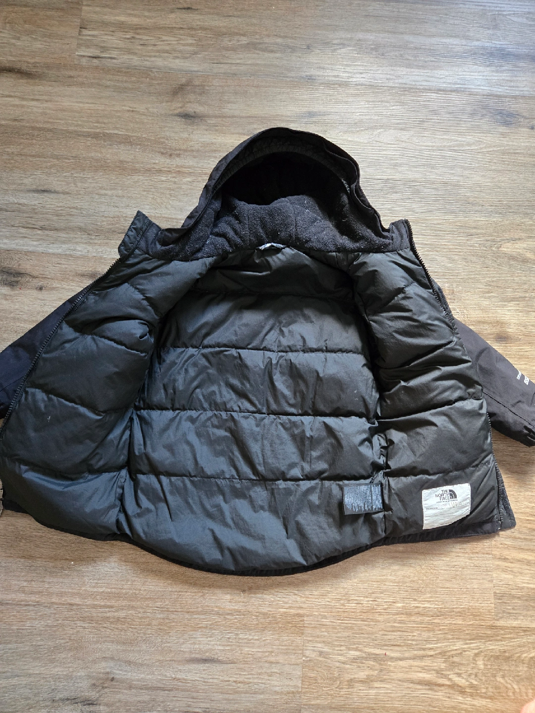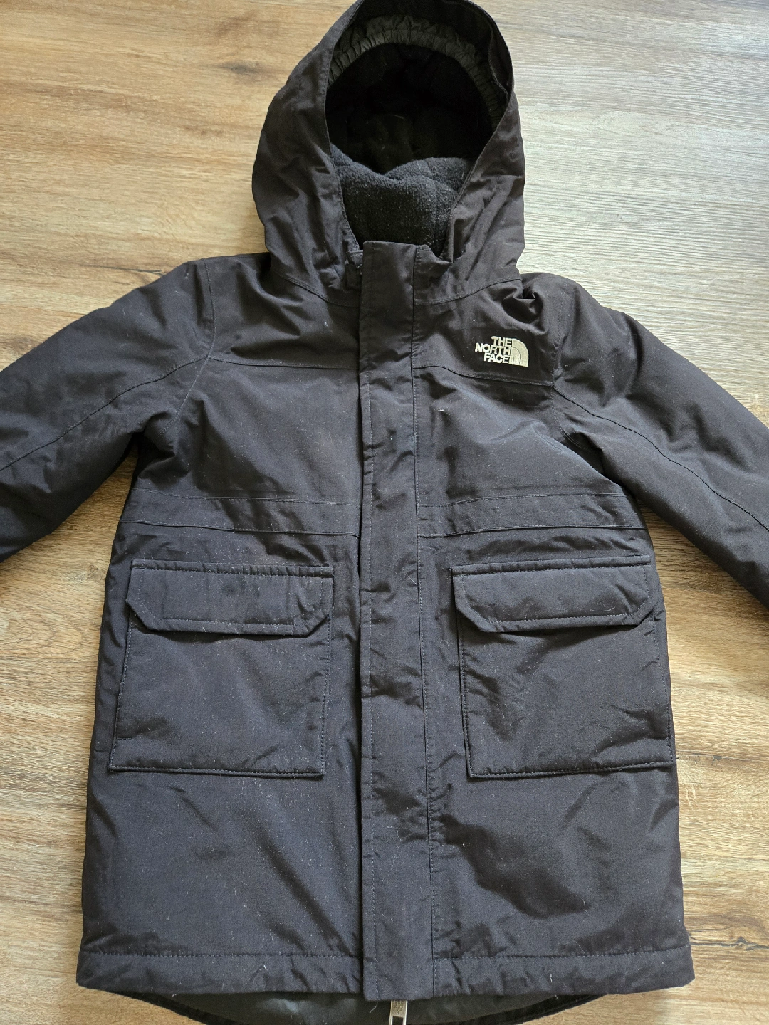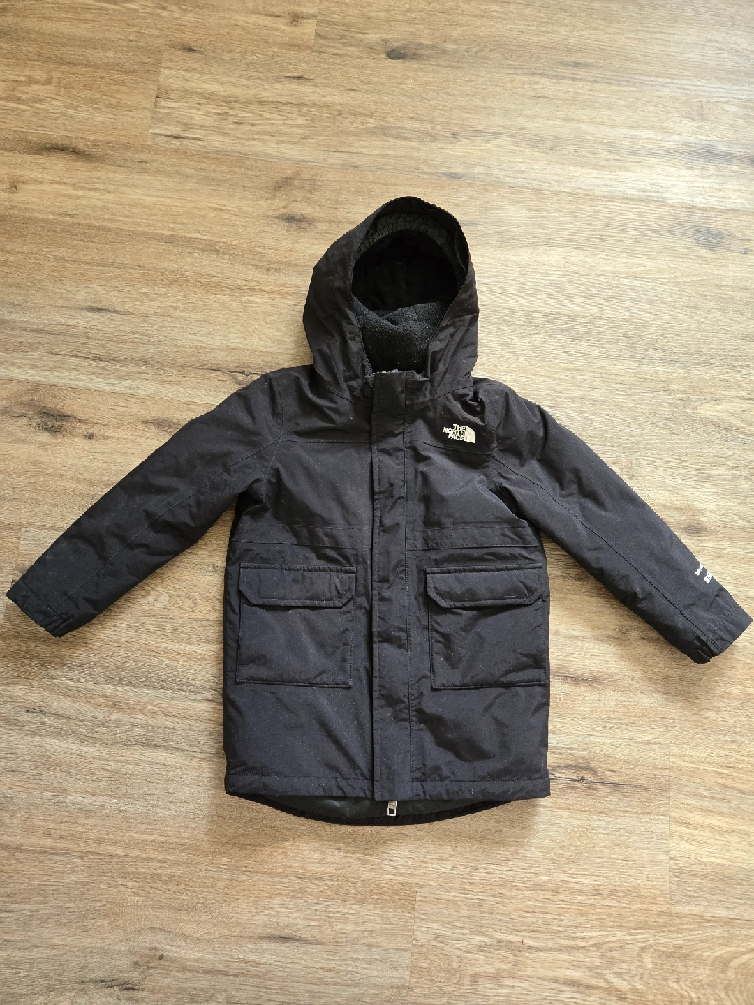 Selling a gently used The North Face winter jacket in black. It's a size 5/6y and perfect for keeping your little one warm during the cold months. It features a hood and several pockets. Ready for a new home!