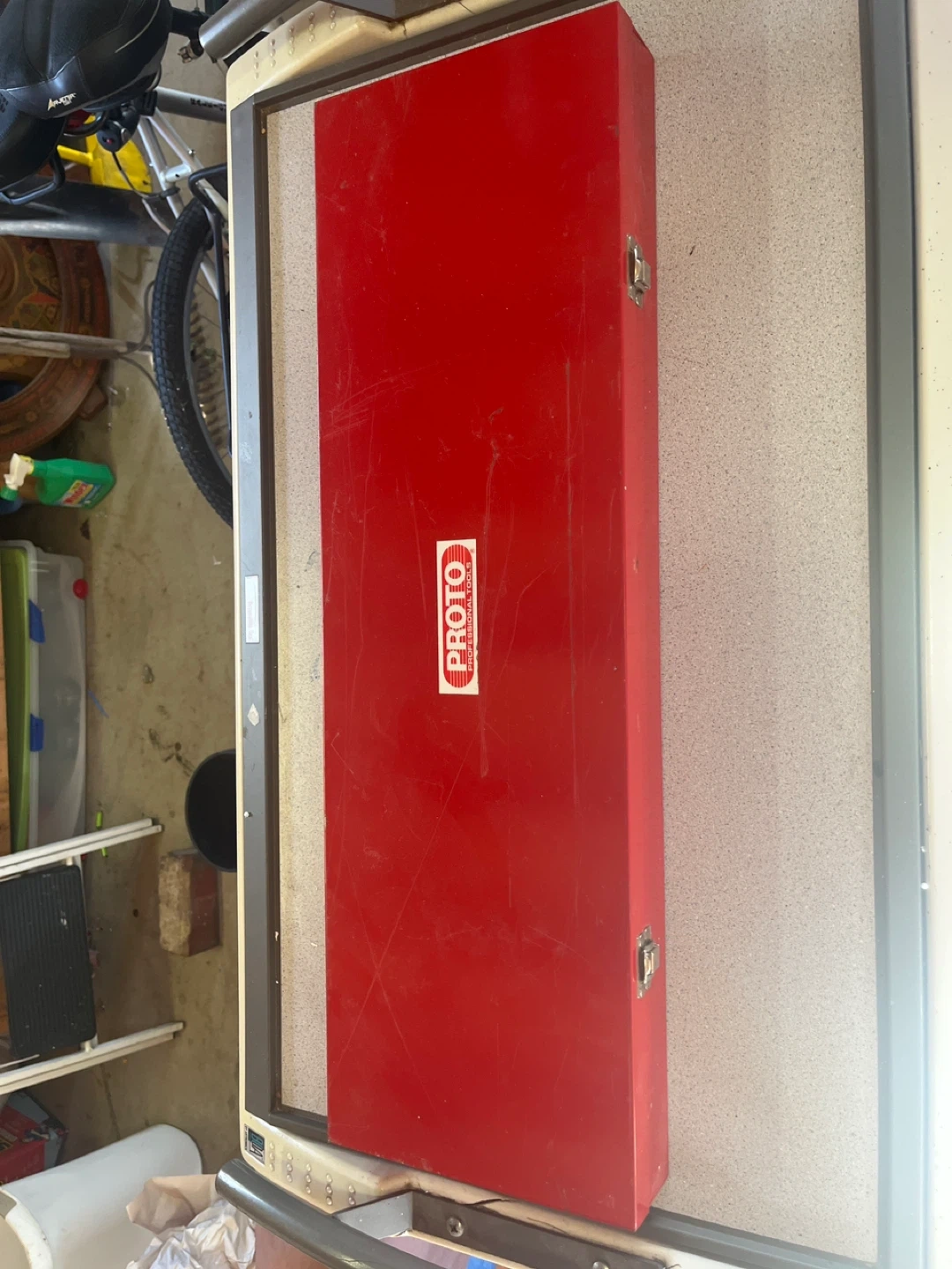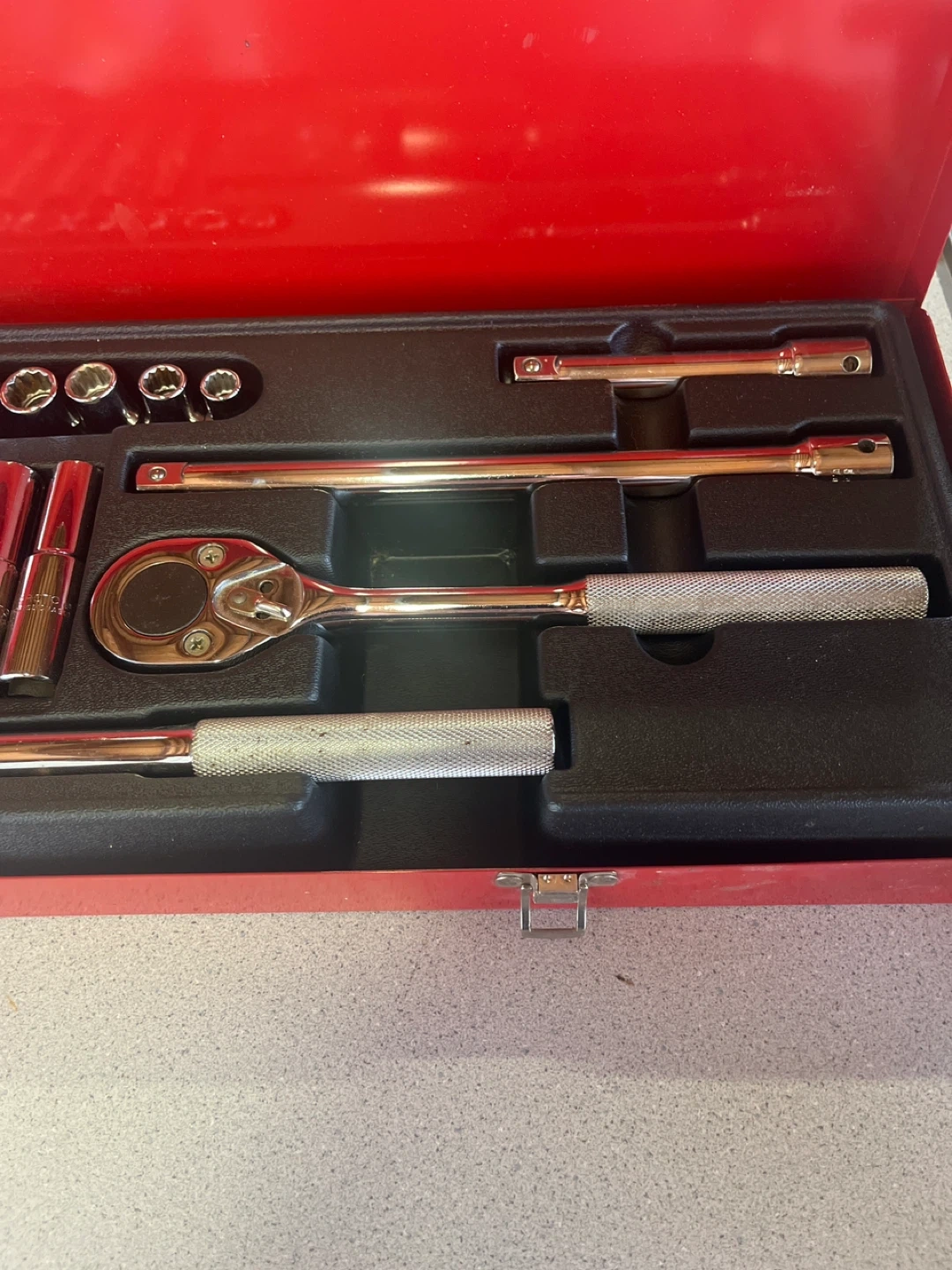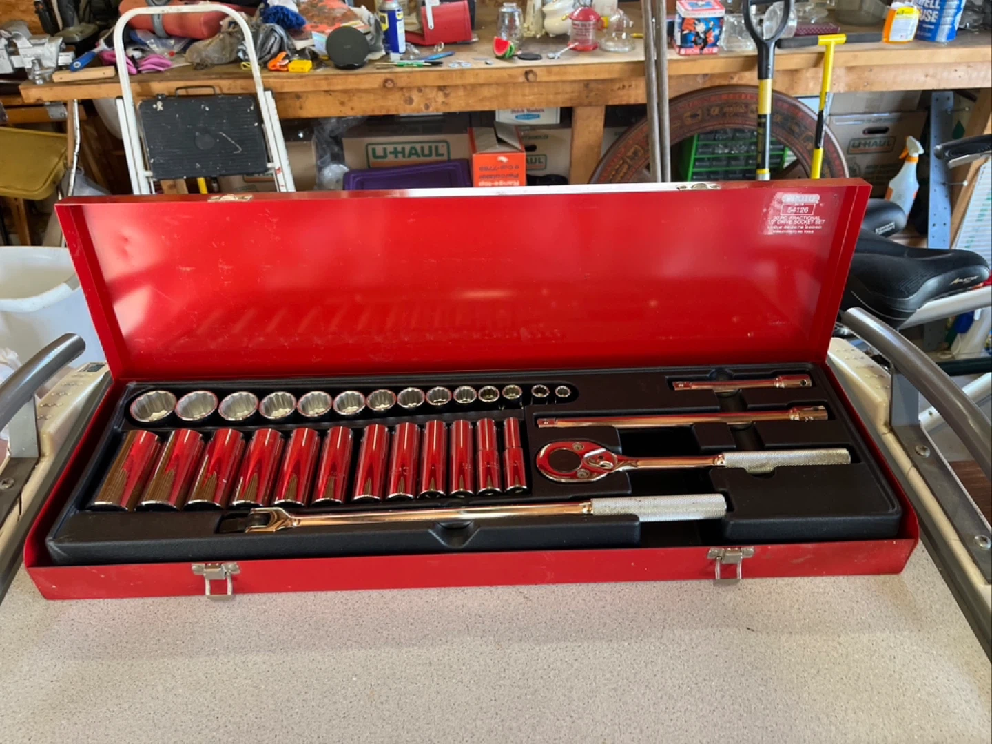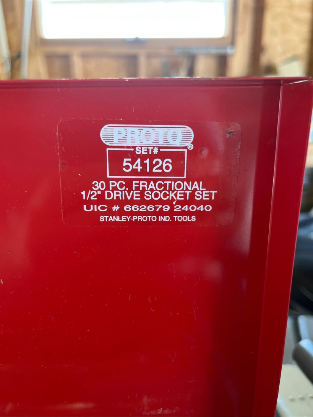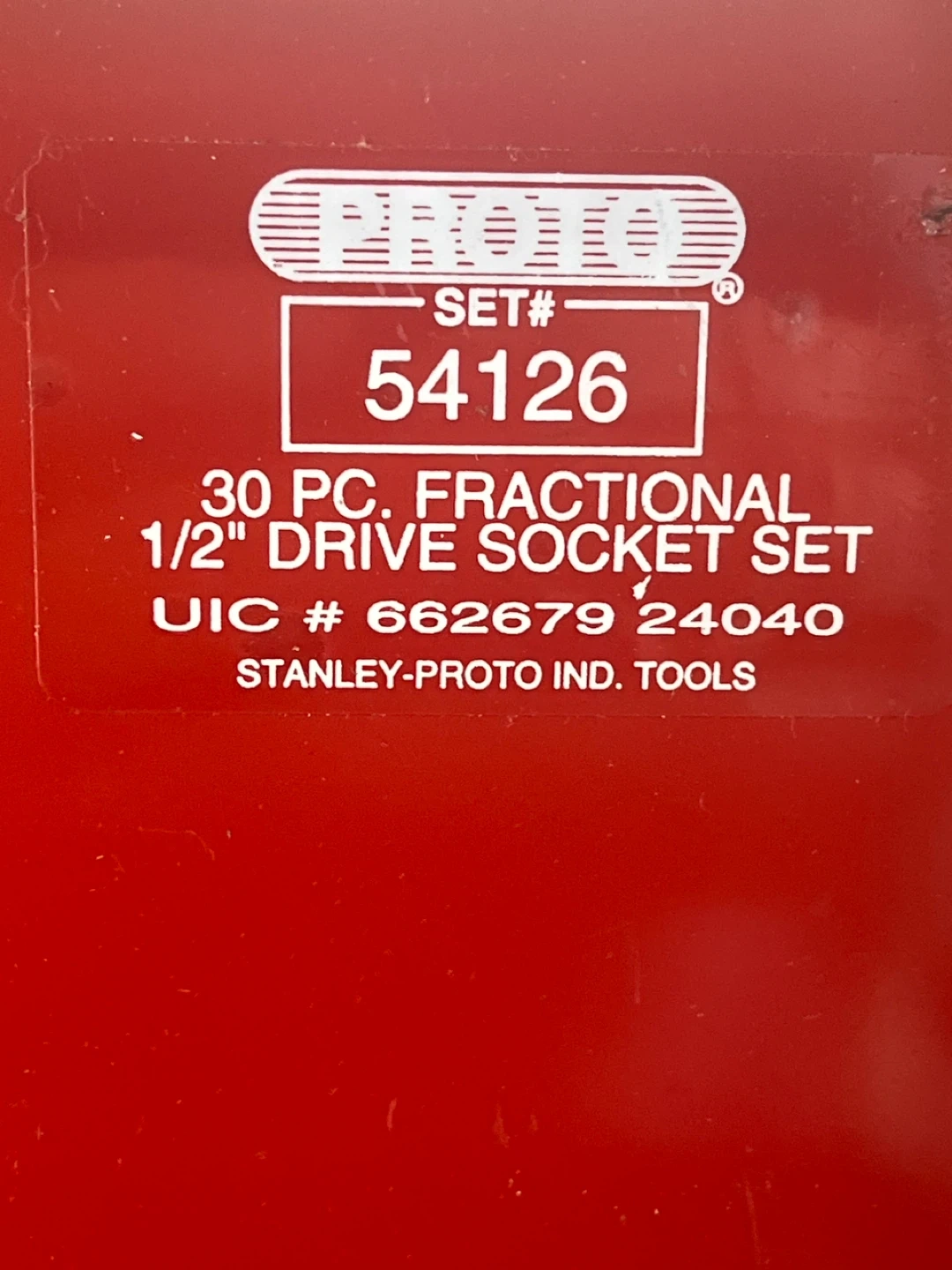 Selling a Proto 30 piece fractional 1/2" drive socket set by Stanley. This is set number 54126. This was never used and is in like new condition. It comes in a red metal case which measures 26” x 8” x2”