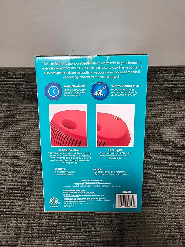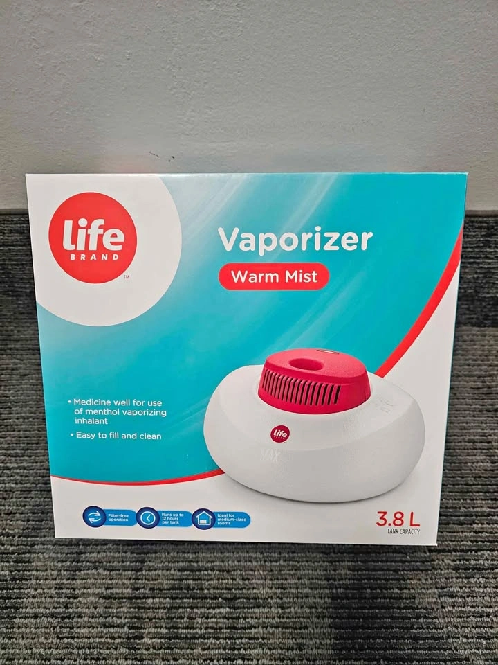 New in box. Only used 1 time. Warm mist vaporizer. Auto shut-off. Medicine well for inhalant. LED light. Easy to fill and clean. Filter-free. Up to 12 hours per tank. Reason for selling I need a humidifier. Pick up Only