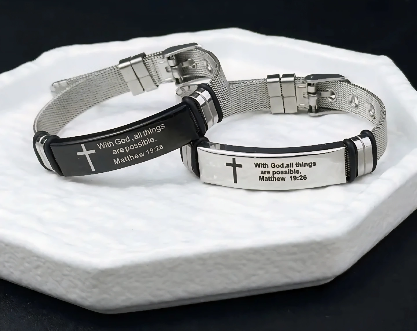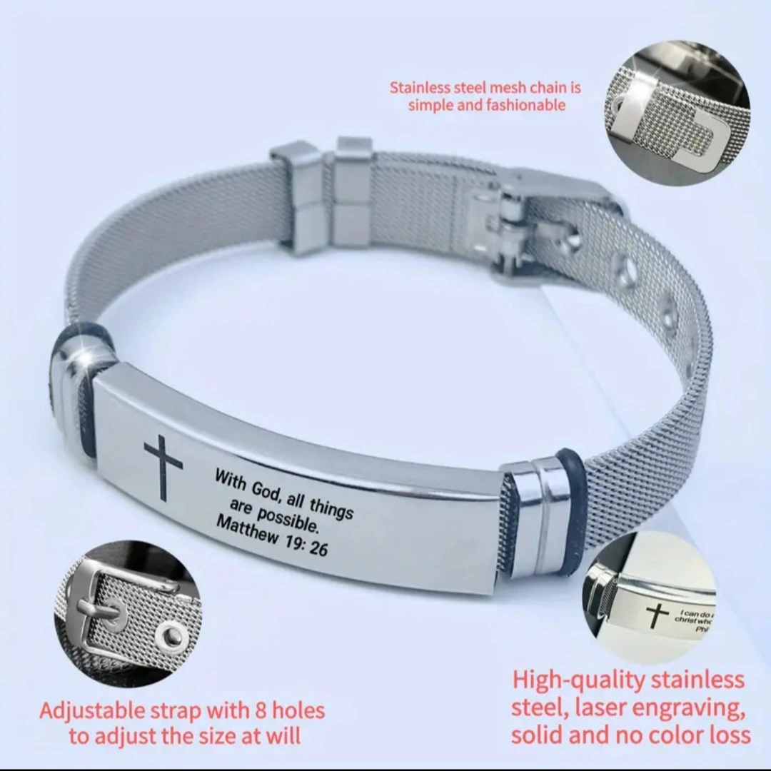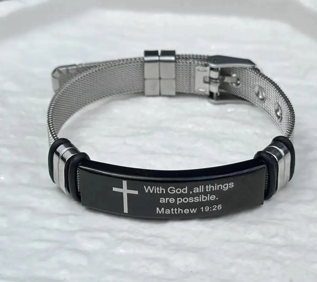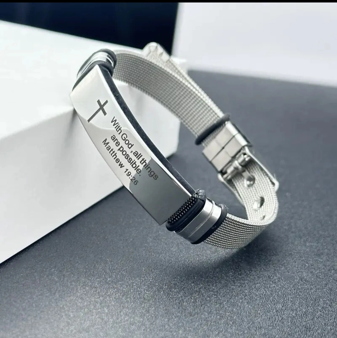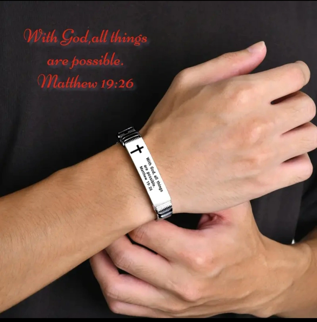 Selling a bracelet engraved with a cross and the text "With God, all things are possible. Matthew 19:26". It's a stylish and meaningful piece of jewelry!