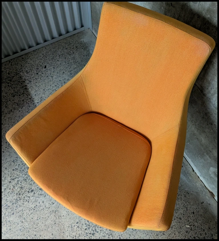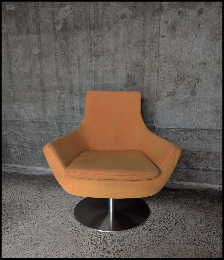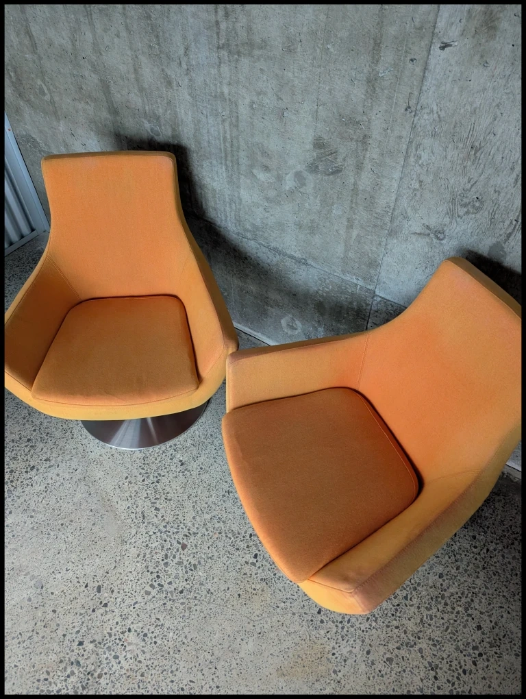 2 swivel Soho Concept chairs Excellent pieces of modern furniture design Contemporary occasional chairs with a stainless steel base. The padded seat cushion enhances the comfort of the chair. The seat has a steel structure with “S” shape springs for extra flexibility and strength. This steel frame molded by injecting polyurethane foam.The chair is suitable for both residential and commercial use. Absolutely gorgeous chairs that will make a big statement Material: orange wool ( brand new chair in this particular finish retails for over $2600 + tax) Material itself has a bit of the fading from the sun exposure.Other than that ,chairs are in excellent condition Covers are removable Dimensions 31"H- 31" W - 28"D Base Swivel Stainless Steel - extremely stable and heavy