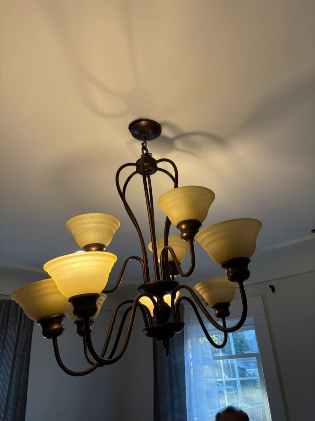 Selling a chandelier with nine lights. It has a bronze-coloured metal frame and frosted glass shades. It would be a great addition to any dining room or living room!