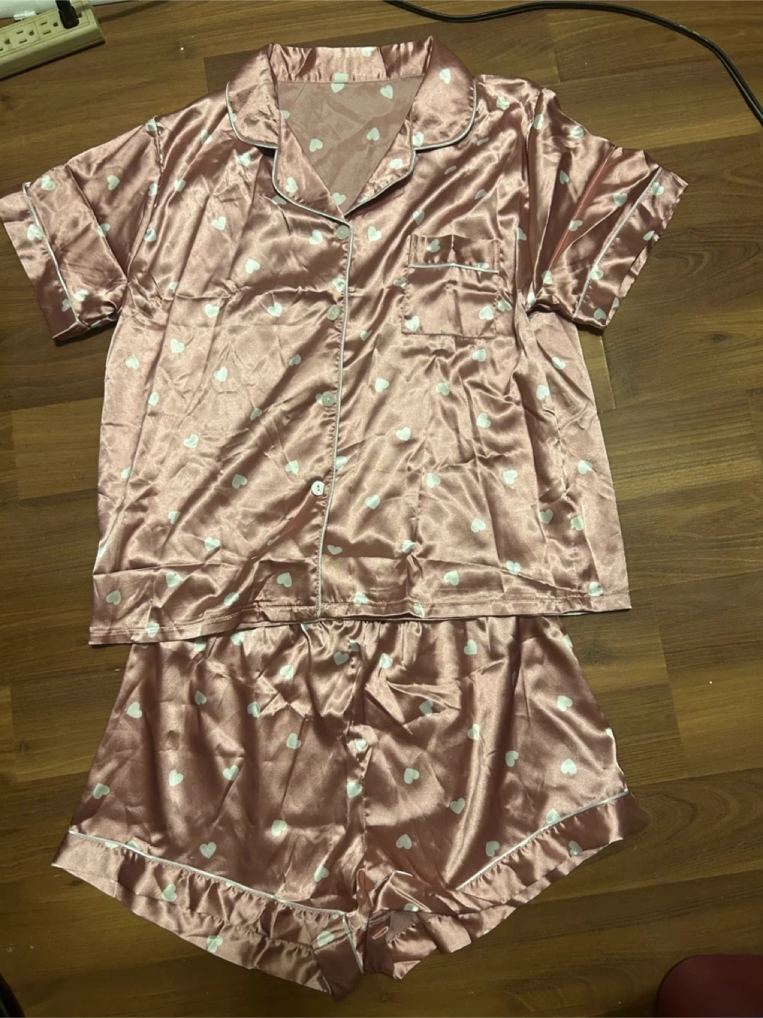 Here's a cute pink satin pajama set with little white hearts! The set includes a short-sleeved button-up top and shorts. Perfect for a comfy night's sleep or lounging around the house