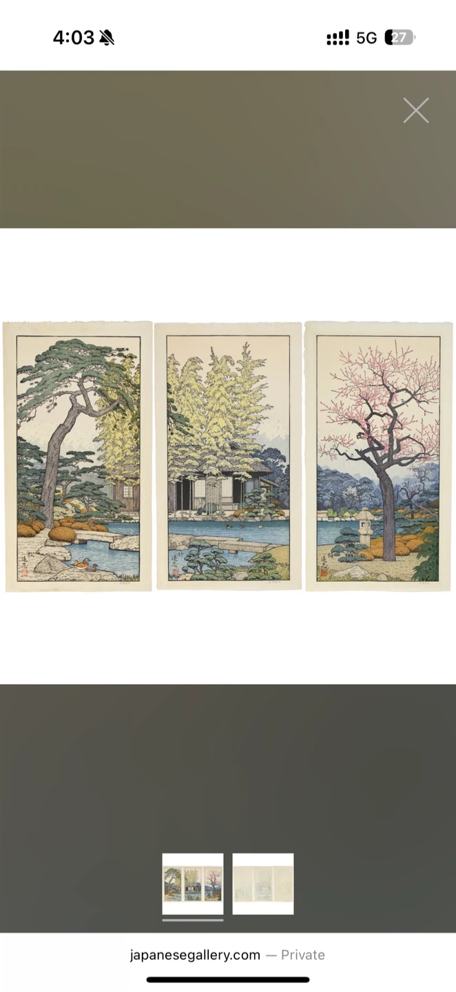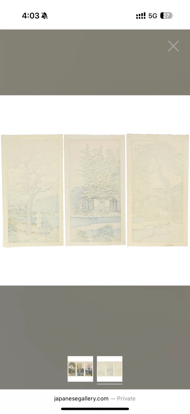 643Issued in 1980 by the Franklin Mint Gallery and published by the Yoshida Family Publishers, this woodblock series (a triptych) was sold individually as well as the series, framed or unframed. Each print is 15″x31″, enabling these beautiful prints to be both stunning in their detail and quality, but also oversized in their impact when most ukiyo-e and shin-hanga prints are 10″x15″ (oban) or smaller. Each is pencil-signed by the artist in Japanese (whereas the rest of his prints are signed in western script). The three prints in the triptych from left to right are: Pine Tree of the Friendly Garden Bamboo Tree of the Friendly Garden Plum Tree of the Friendly Garden This triptych comes with the three original certificates of authenticity in the original pamphlets. The Woodblock Prints This triptych is kakemono sized (approximately 15″ x 31″ each), making this a large and powerful composition. The prints are in excellent condition with strong color and clean margins (no foxing, fading or mat burn). Small areas of residue of the tape that was used by the Franklin Mint when they framed the pieces which left residue on the top margin of the verso. About the Artist Toshi Yoshida (吉田 遠志, July 25, 1911 – July 1, 1995) was a Japanese artist known for his mastery of the traditional Japanese woodblock printmaking technique of moku-hanga. Born in Tokyo, Toshi was the son of the famous woodblock print artist Hiroshi Yoshida. He began studying art at an early age and quickly developed his skills as a printmaker. Toshi’s work was characterized by its attention to detail and its use of vivid, bold colors. He often depicted natural landscapes and scenes of everyday life, and his prints were highly sought after by collectors around the world. In addition to his printmaking, Toshi was also a skilled painter and illustrator. He worked on a number of book projects, including a series of children’s books that he both wrote and illustrated. Toshi’s influence on Japanese art and culture can still be felt today. His work has been exhibited in museums and galleries around the world, including the National Museum of Modern Art in Tokyo and the Museum of Fine Arts in Boston. His prints are highly prized by collectors and are considered to be some of the finest examples of modern Japanese printmaking. Toshi also made significant contributions to the art of printmaking through his teaching and mentorship of young artists. He established a printmaking school in Tokyo and taught many aspiring printmakers the traditional techniques of moku-hanga. Throughout his career, Toshi remained dedicated to the preservation and promotion of traditional Japanese art. He was honored with numerous awards and honors for his contributions to the art world, including the Order of the Rising Sun, one of Japan’s highest civilian honors.