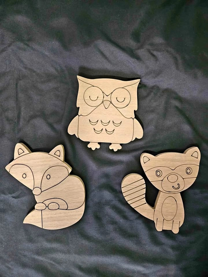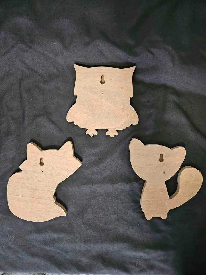65Wood Forest Animals Wall Decor - Set of 3. Owl, fox, racoon. Approximately 6"-7.5" in size. Cash offers only.