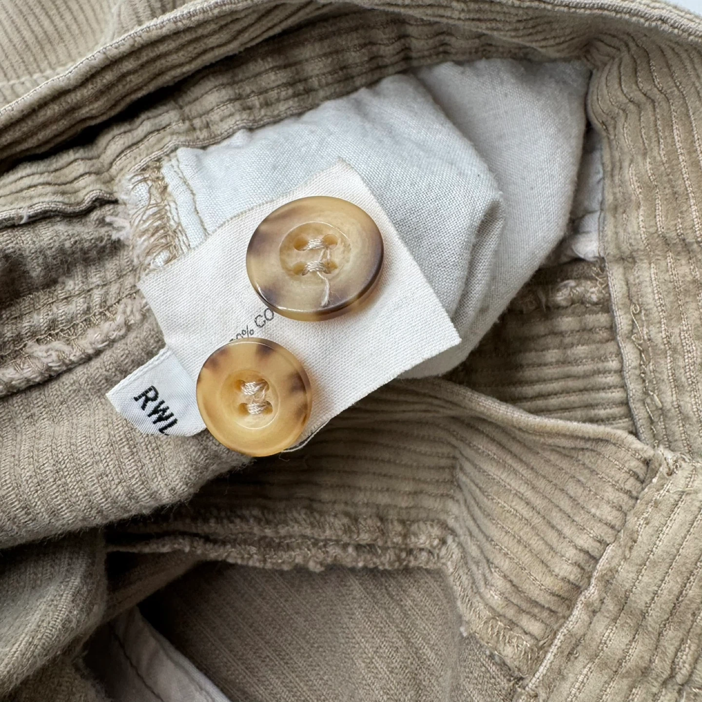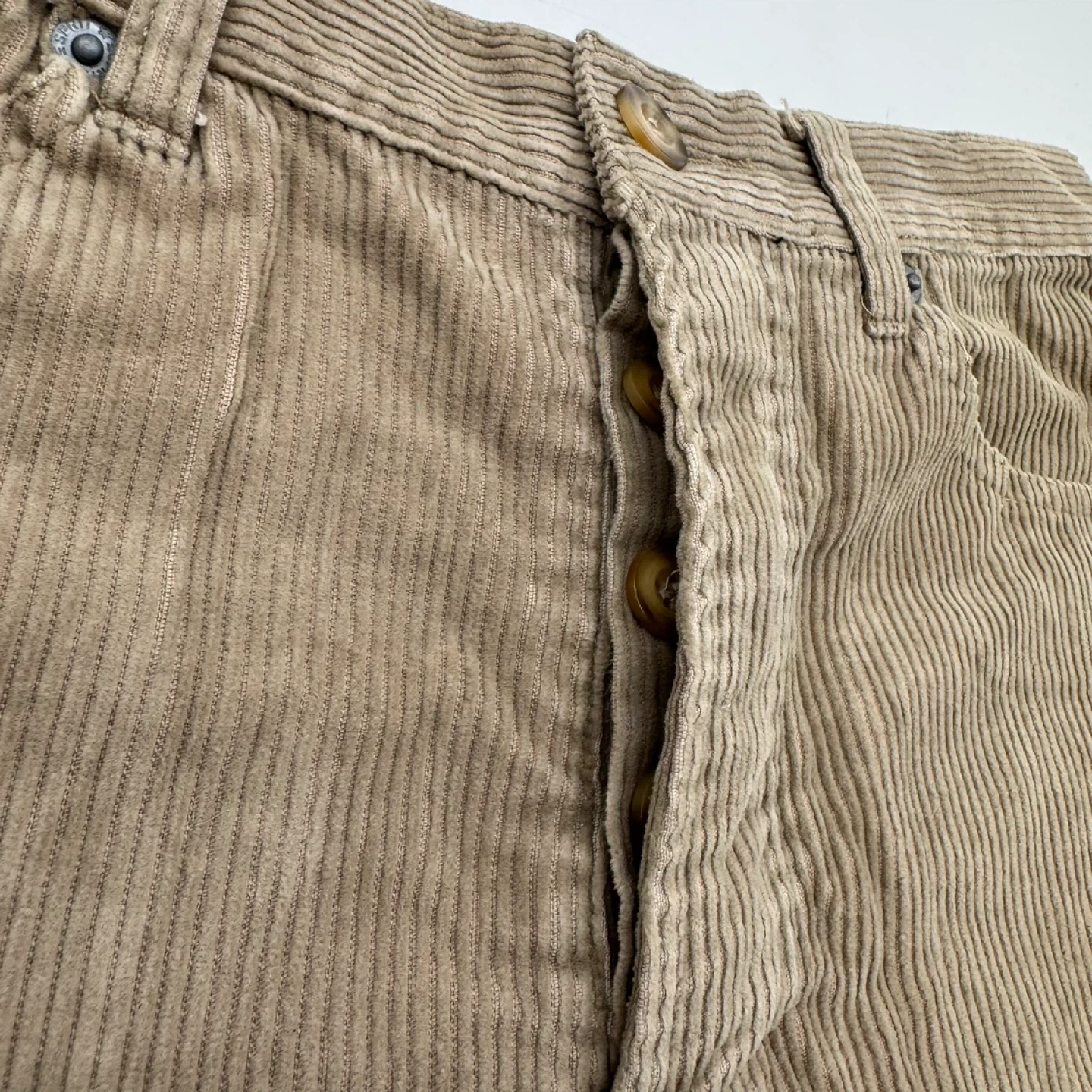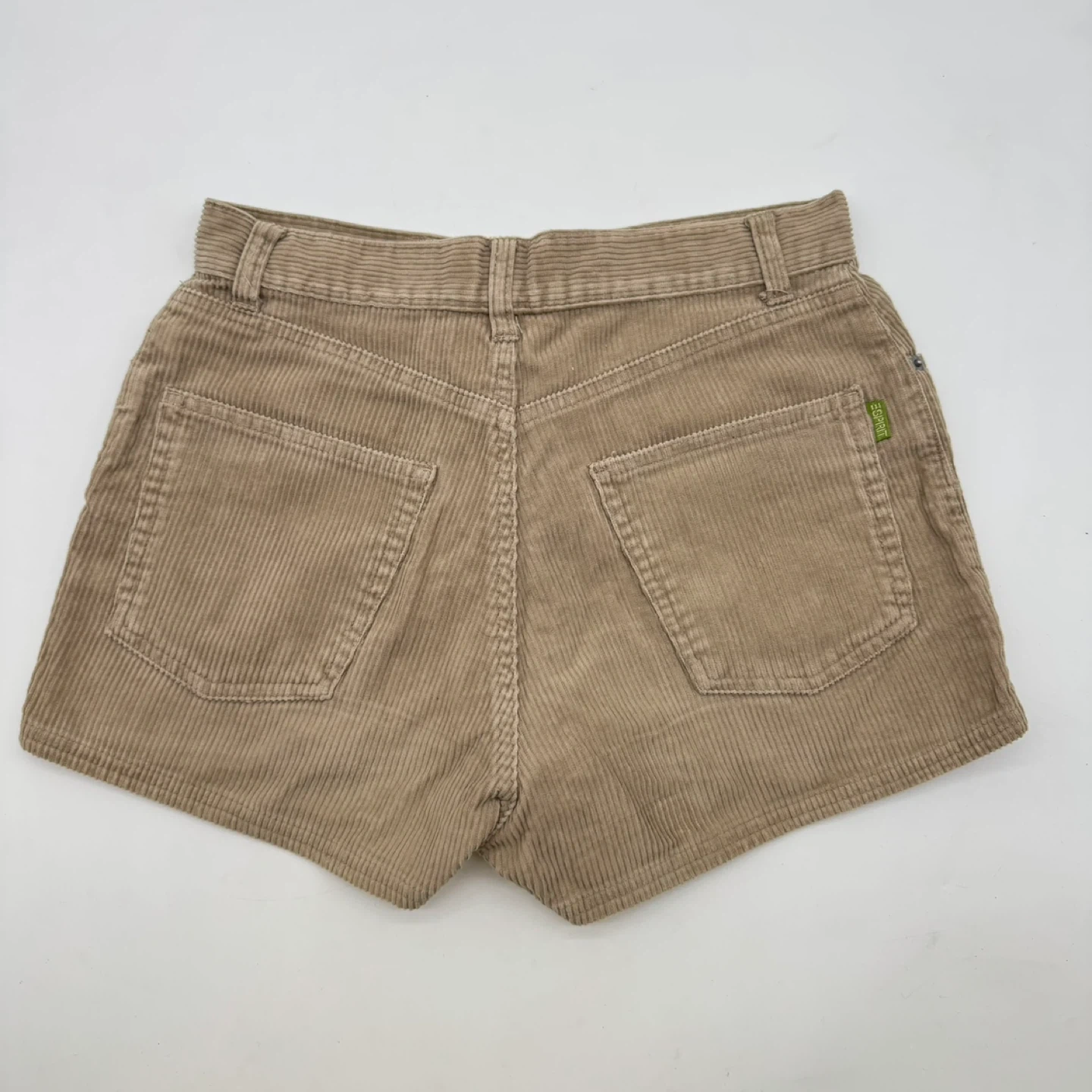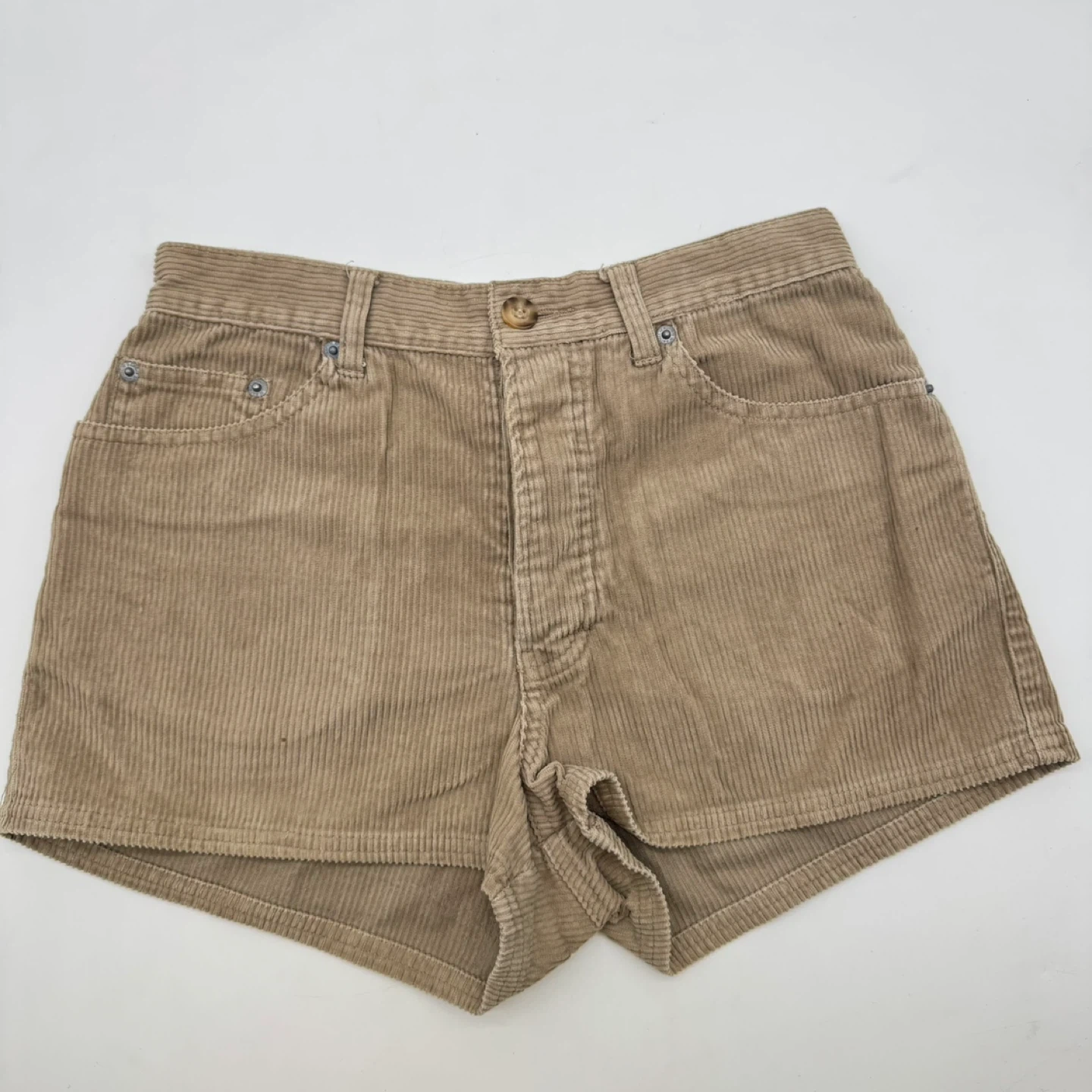 Vintage Esprit women's corduroy shorts in tan color. Made with soft ribbed corduroy fabric, featuring front and back pockets, button fly closure, and a classic retro look. These shorts offer a stylish vintage vibe and comfortable fit