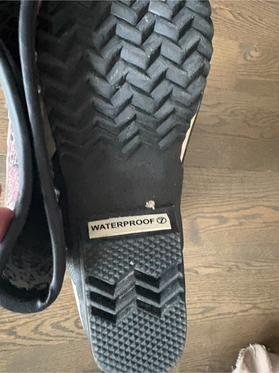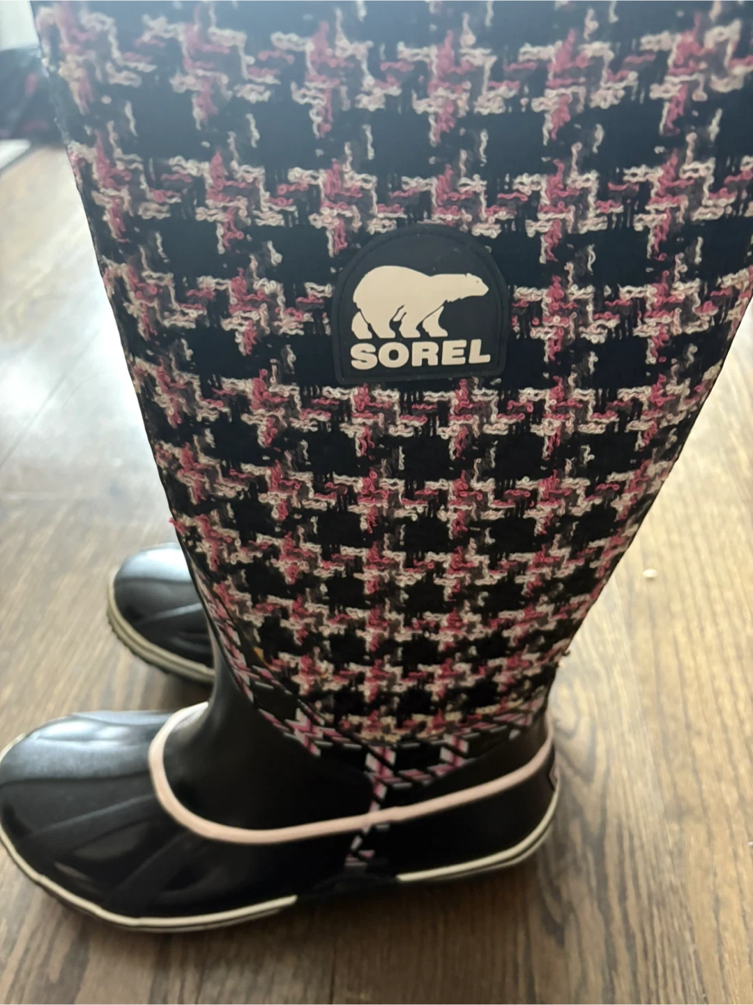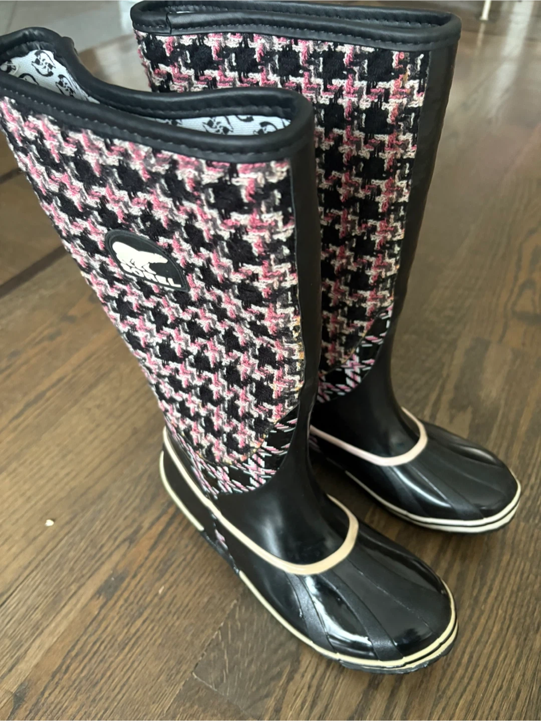 Selling a pair of Sorel rain boots! They feature a black and pink houndstooth pattern on the upper part of the boot. The lower part is black and shiny. They are waterproof and in great condition!
