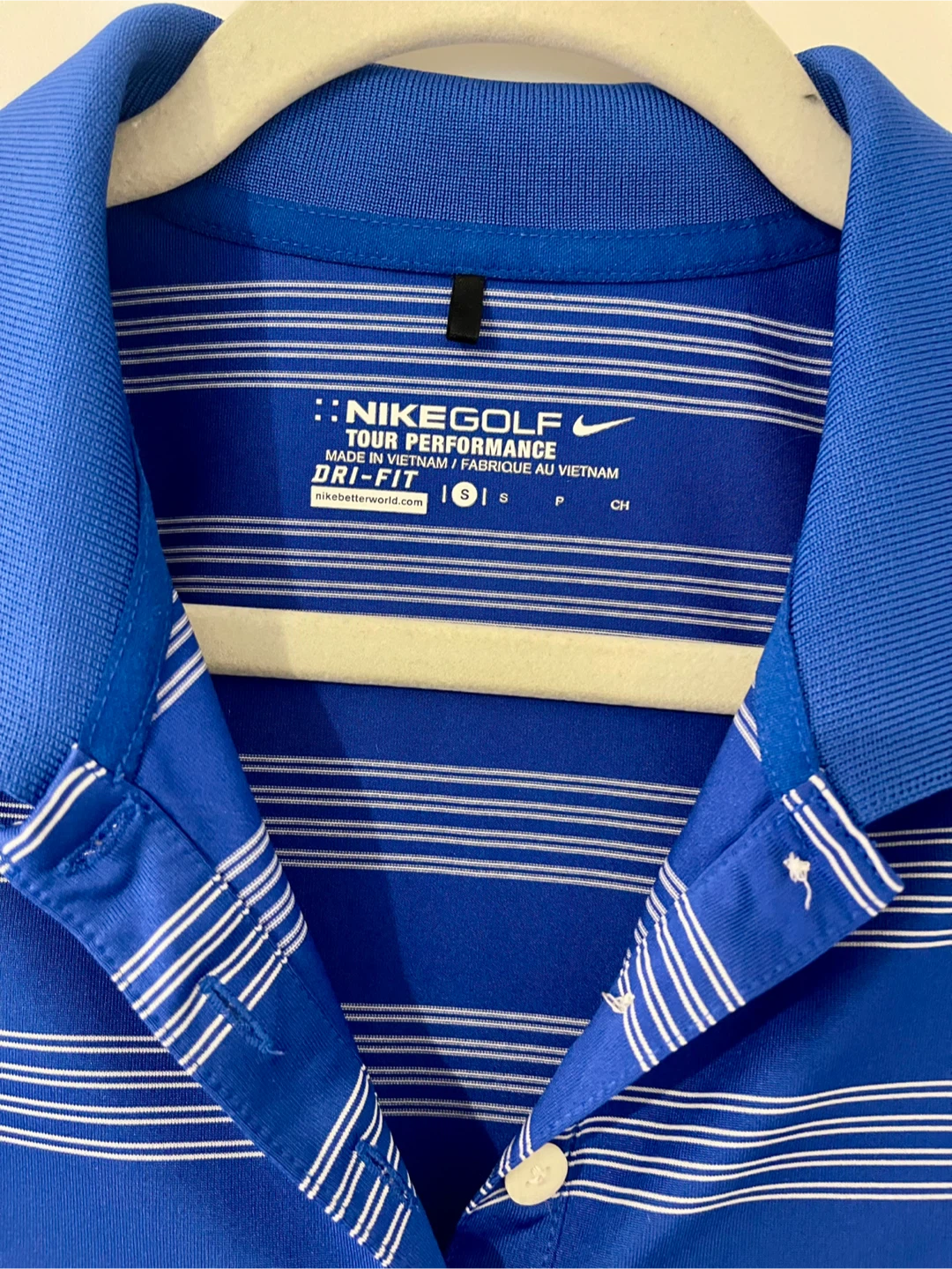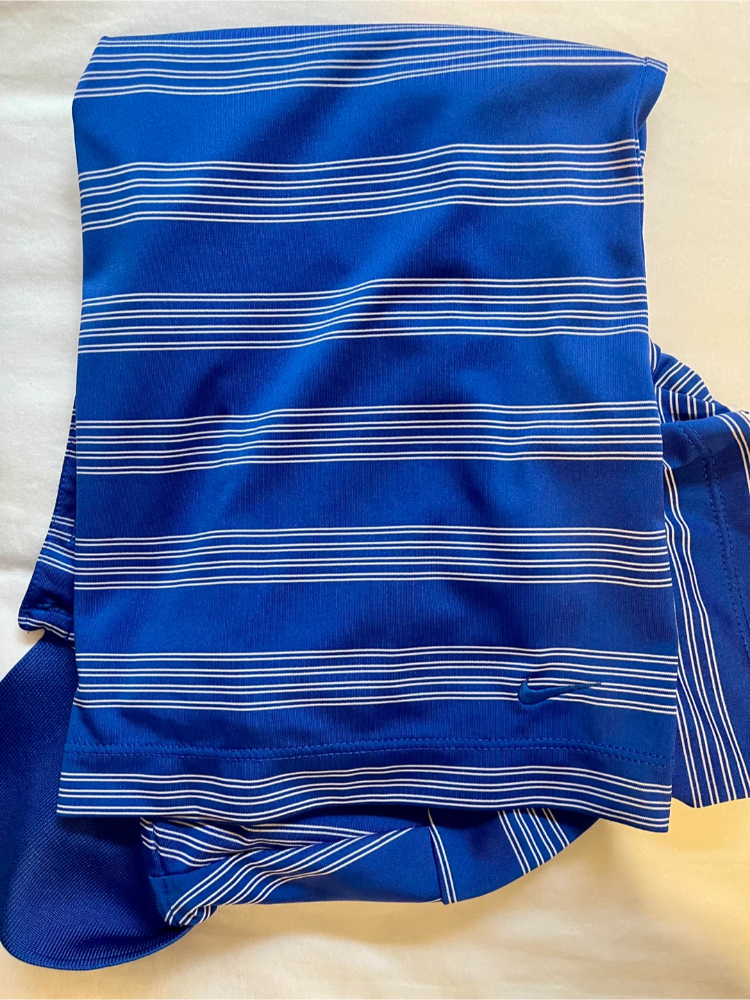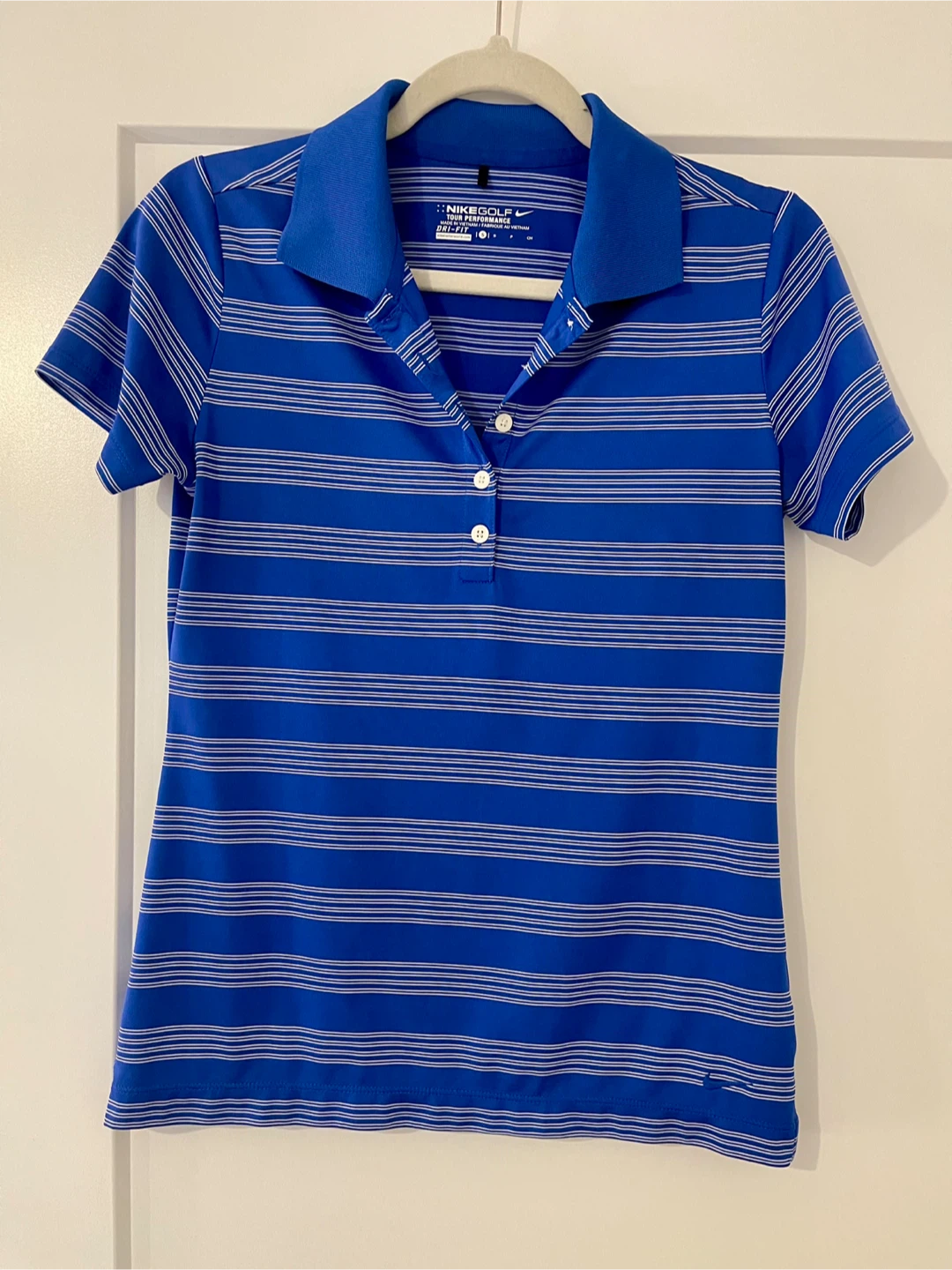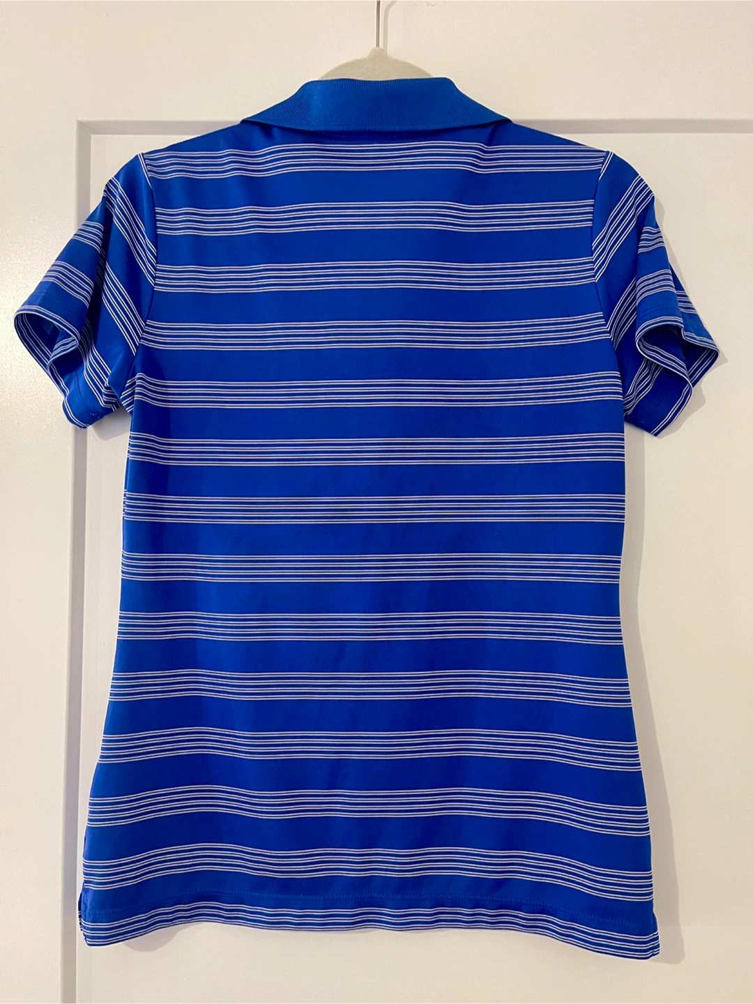 Like new Nike Golf dry fit polo. The shirt features Nike's Dri-FIT technology, perfect for staying cool on the golf course or just out and about. Blue and white stripes with collar and Nike emblem in bottom corner. Size Small.