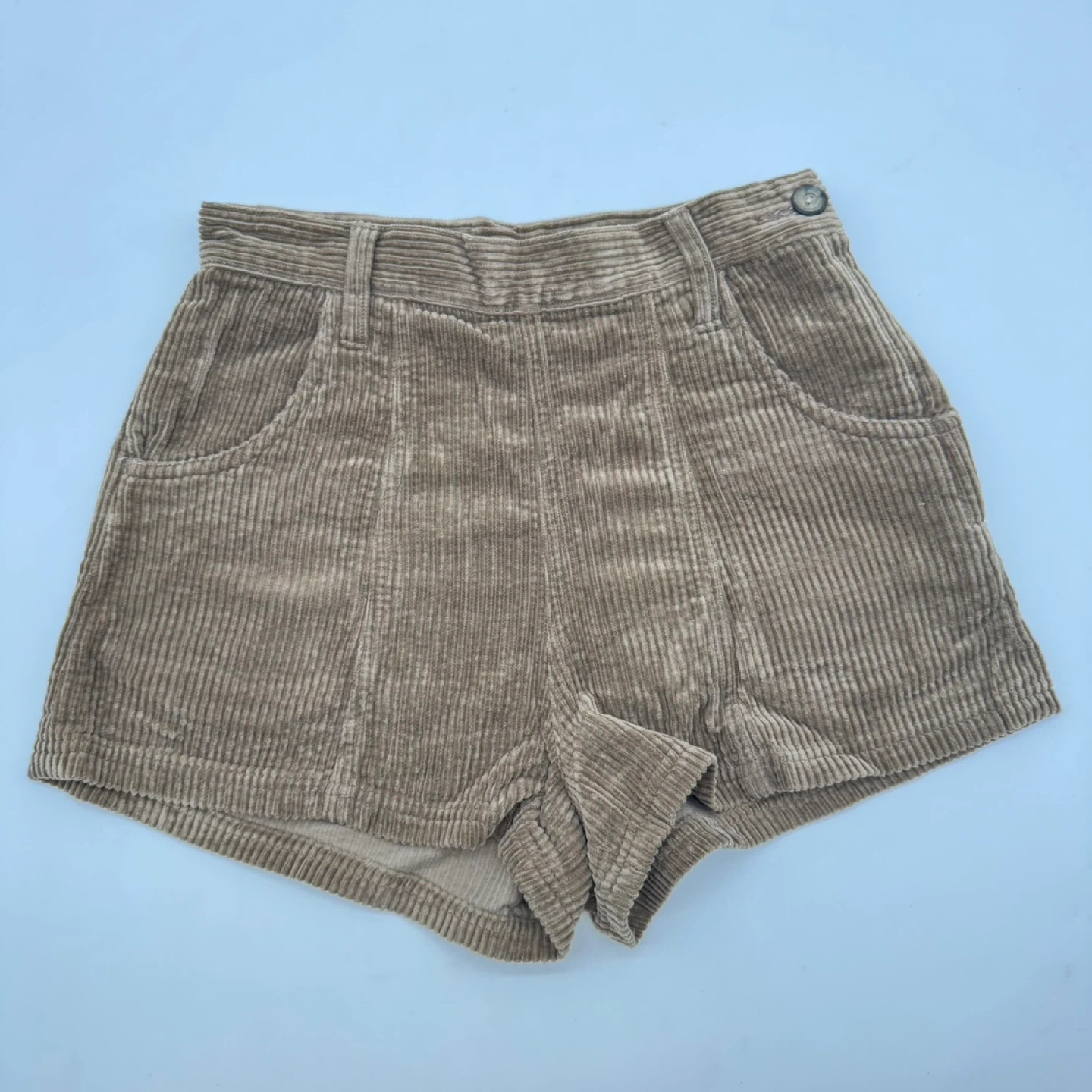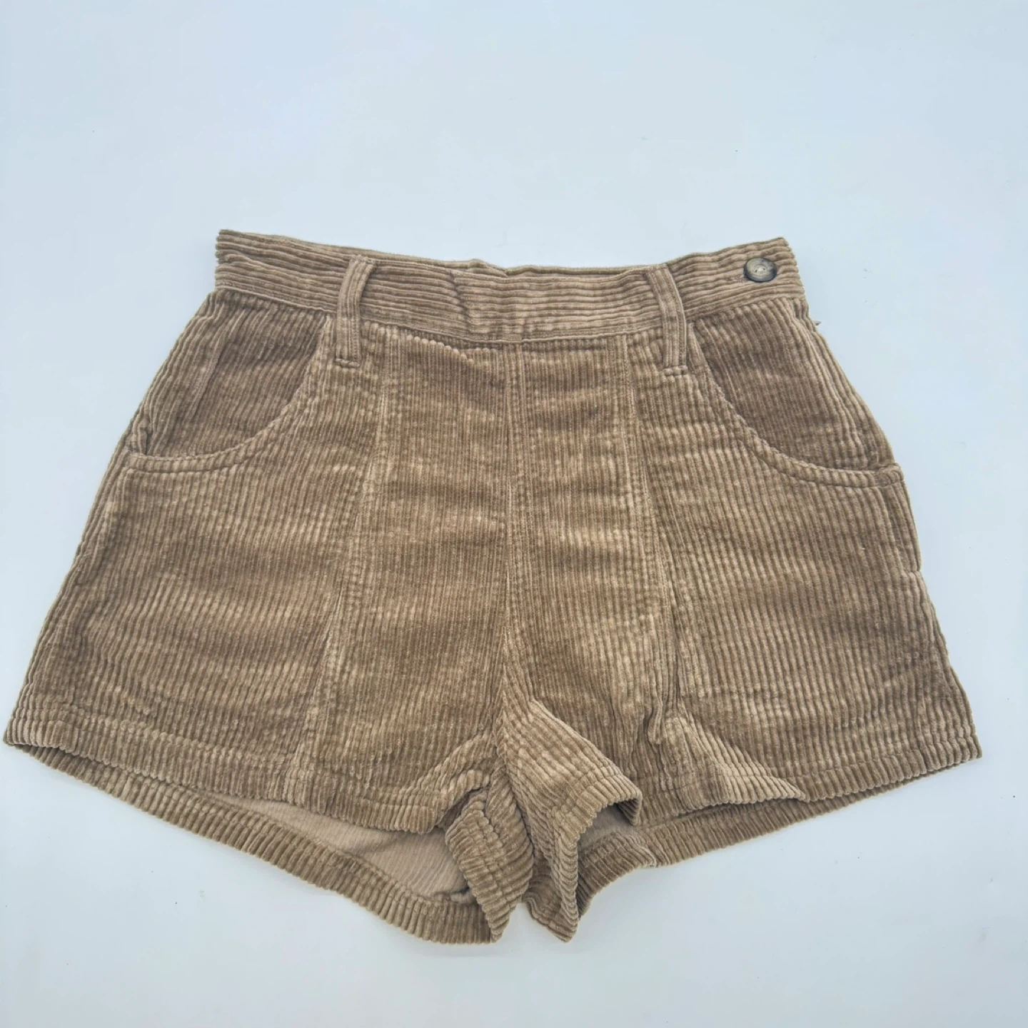 Made from soft tan corduroy fabric, they feature a high-waisted fit, front zipper and button closure, and two front pockets for a classic retro look.