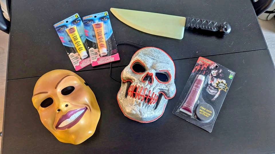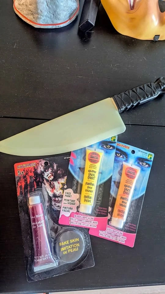 98Purge mask X1 Skeleton glow in the dark mask X1 Fake butcher knife Fake blood Yellow & Orange glow in the dark face paint Will also sell masks separately ($15 each)