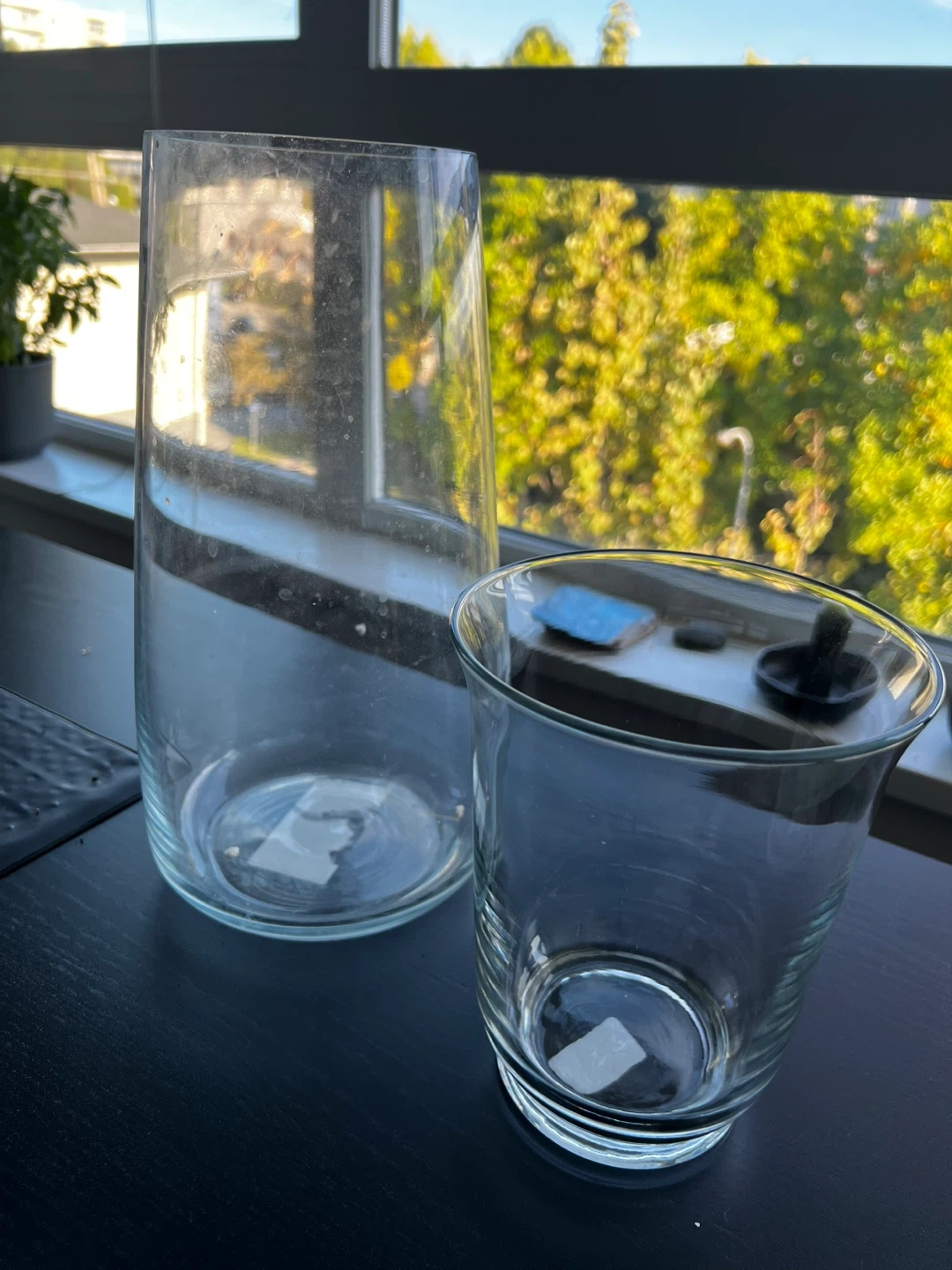Selling two clear glass vases. They're perfect for displaying flowers or adding a decorative touch to any room. One is taller and more cylindrical, while the other is shorter and wider. Both are in great condition and ready to find a new home!
