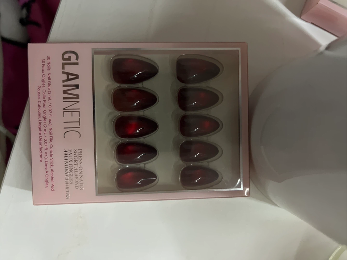 I'm selling some Glamnetic press-on nails in the short almond shape. Each set includes nails, nail glue, a nail file, a cuticle stick, and an alcohol pad. Perfect for a quick and easy manicure at home