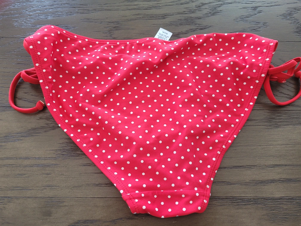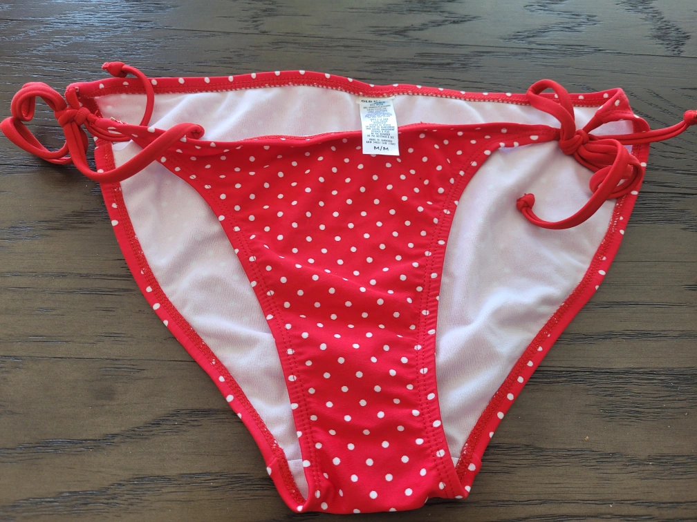132Old Navy Red Polka Dot Bikini Bottoms - Size M Red and white polka dot bikini bottoms from Old Navy in size medium! The outer material is 84% nylon and 16% spandex/elastane. The lining is 100% polyester. These bottoms feature cute tie details on the sides