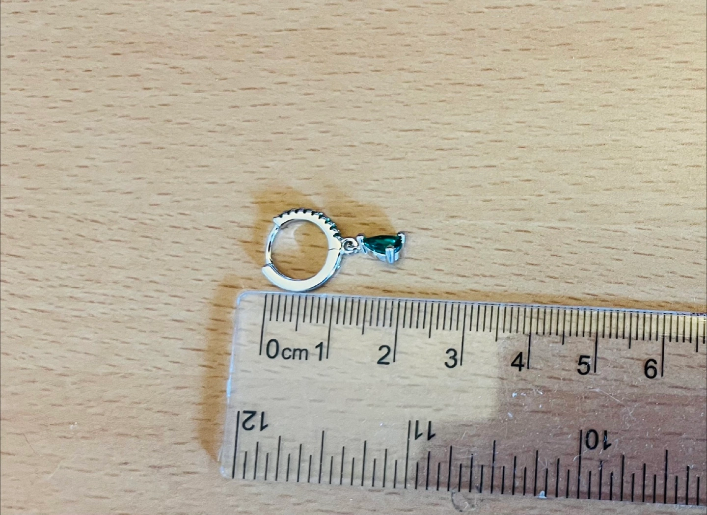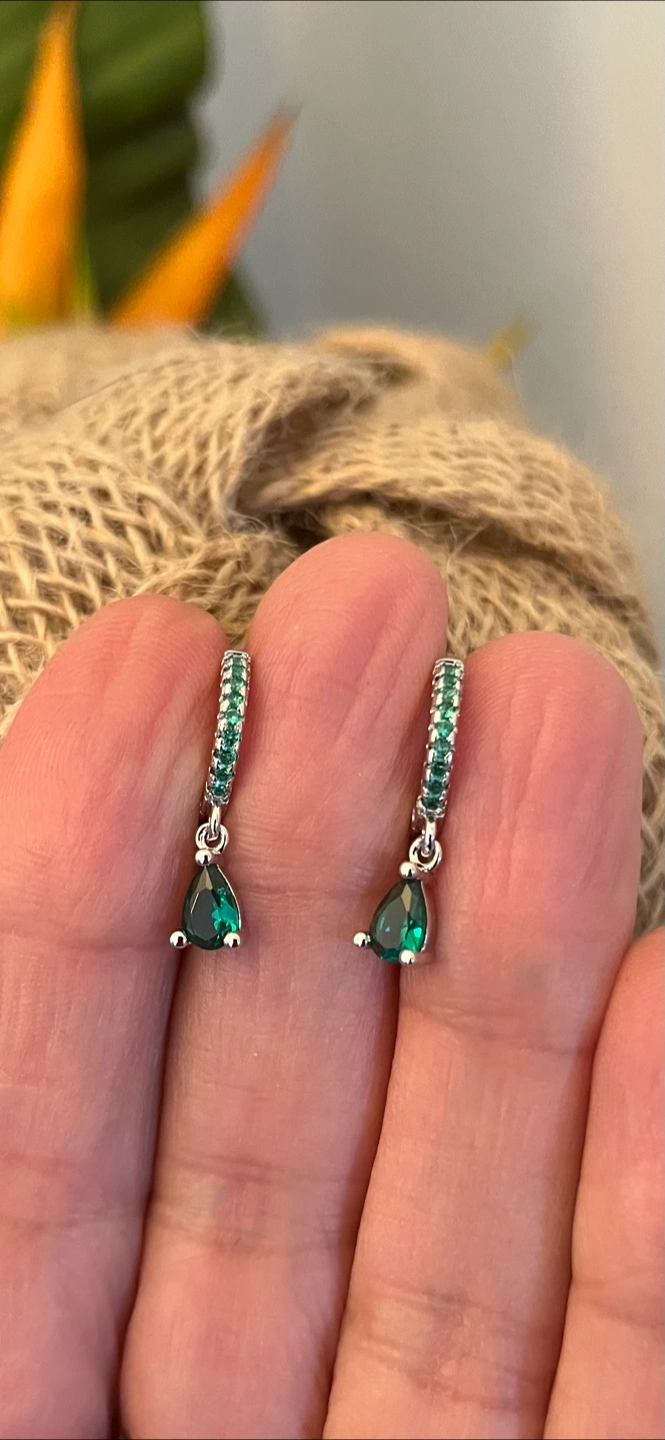These are a pair of lovely emerald inspired drop earrings. The earrings feature a teardrop-shaped emerald stone dangling from a silver hoop adorned with smaller stones They are about 2cm in length.