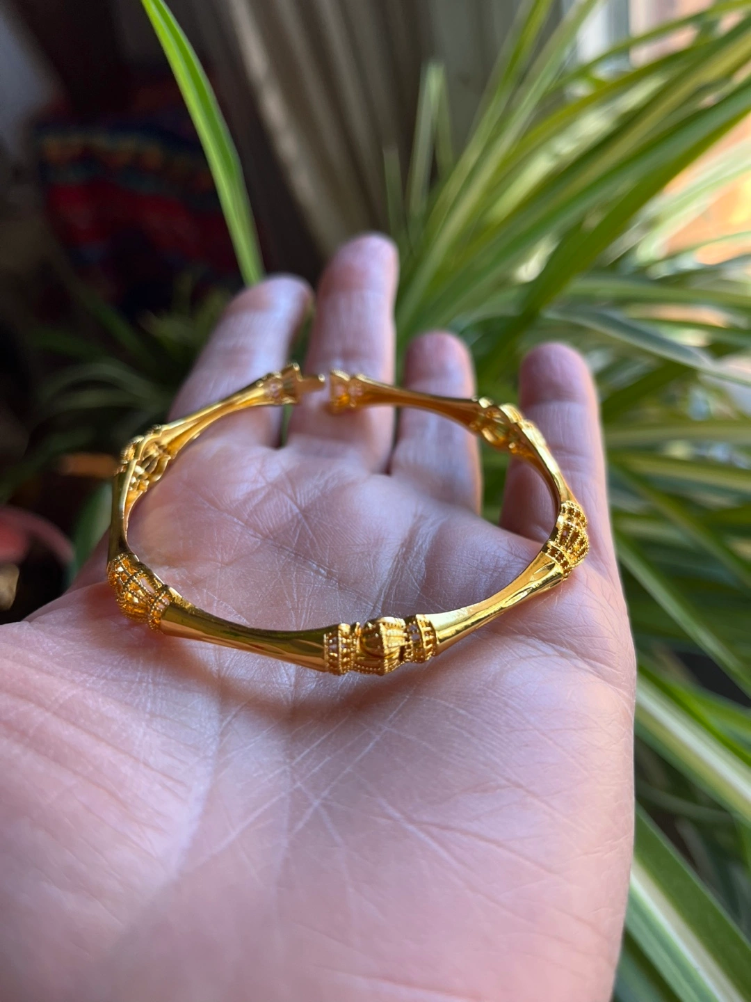 Selling a gold-coloured bangle bracelet with a bamboo design. It's new and measures approximately 6.5 cm in diameter. It's a beautiful piece to add to your collection!
