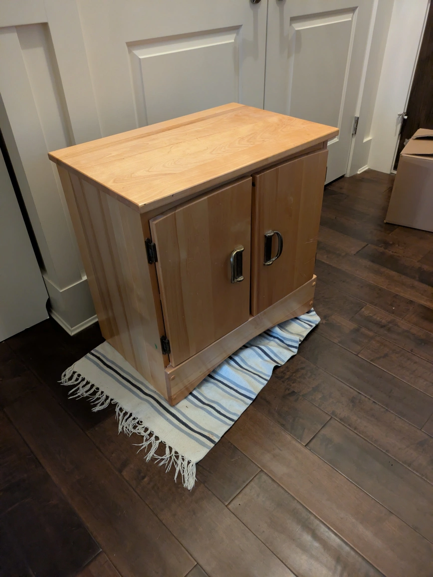 Selling a sturdy wooden cabinet! It has a door with a metal handle and an interior shelf for storage. Perfect for adding some extra storage space to any room in your home