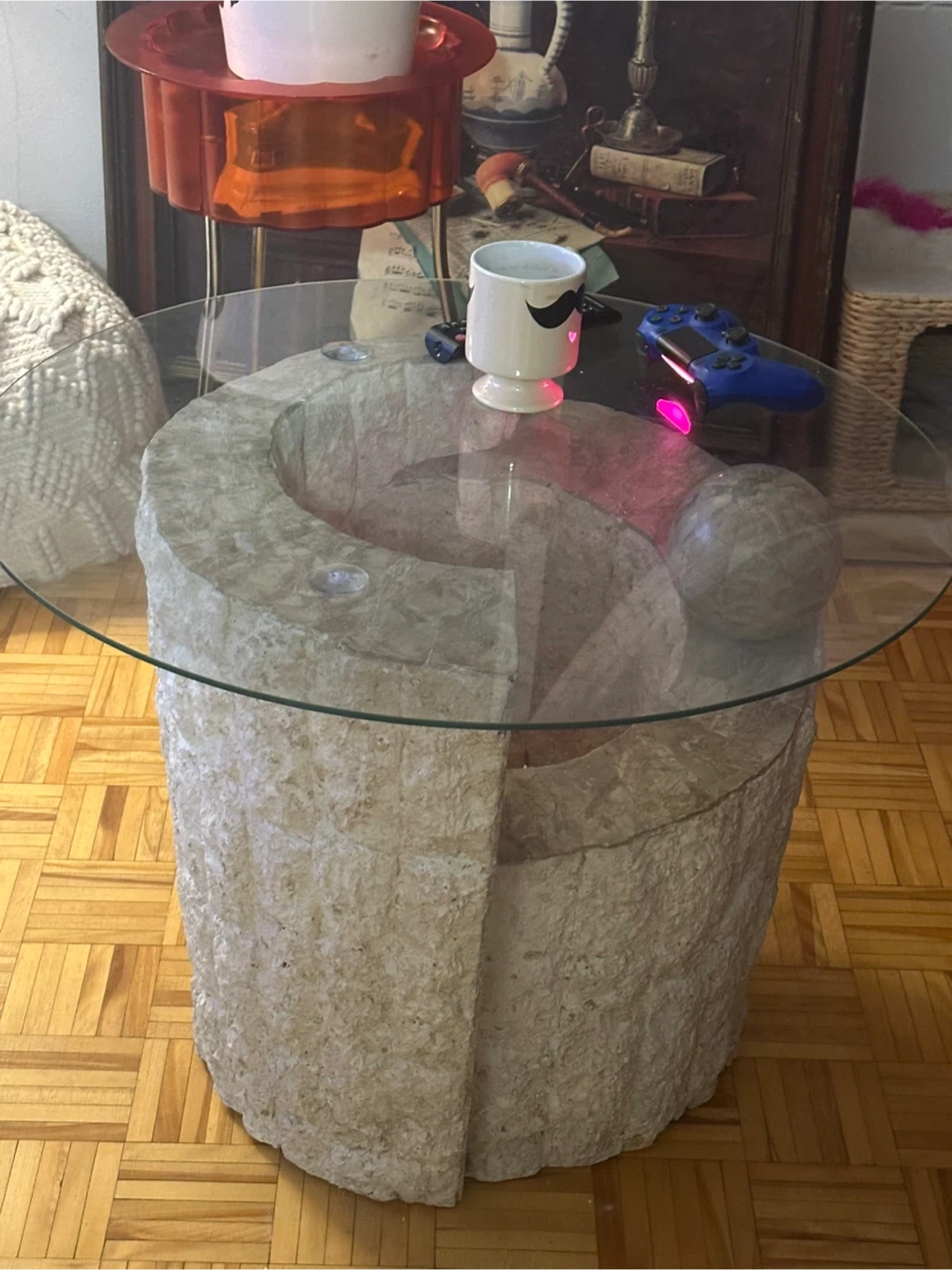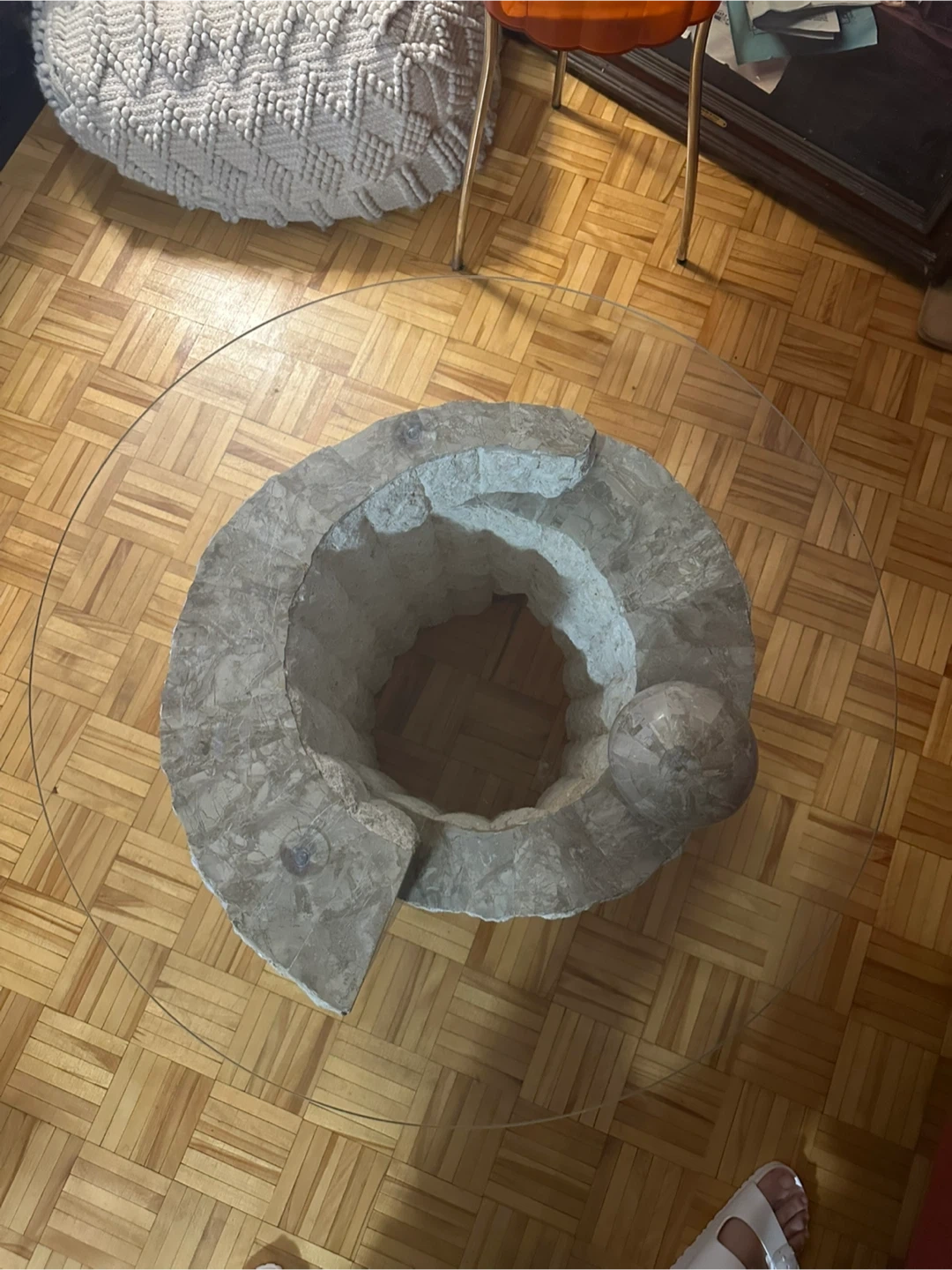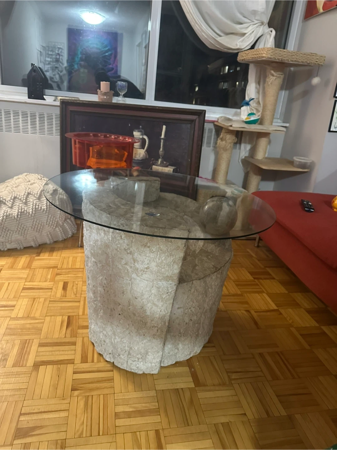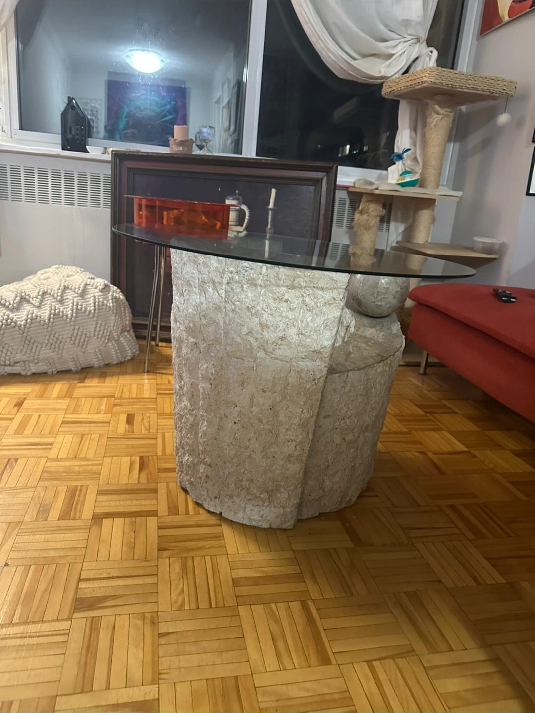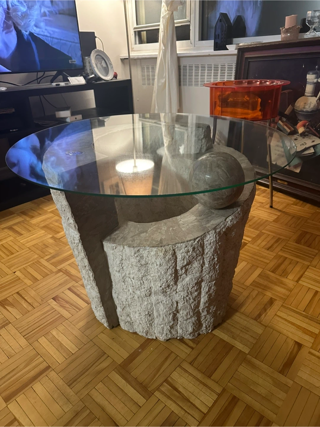 Selling a unique coffee table featuring a stone base and a glass top! It's a real statement piece. The base has a textured, organic look, and the glass top is round. It's in great condition and ready to add some character to your living room Its a move out sale so don’t miss this chance to save on such an expensive item! Pick up Yonge Eglinton Etransfer or cash is acceptable